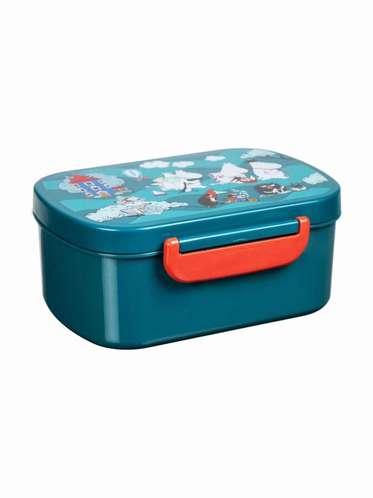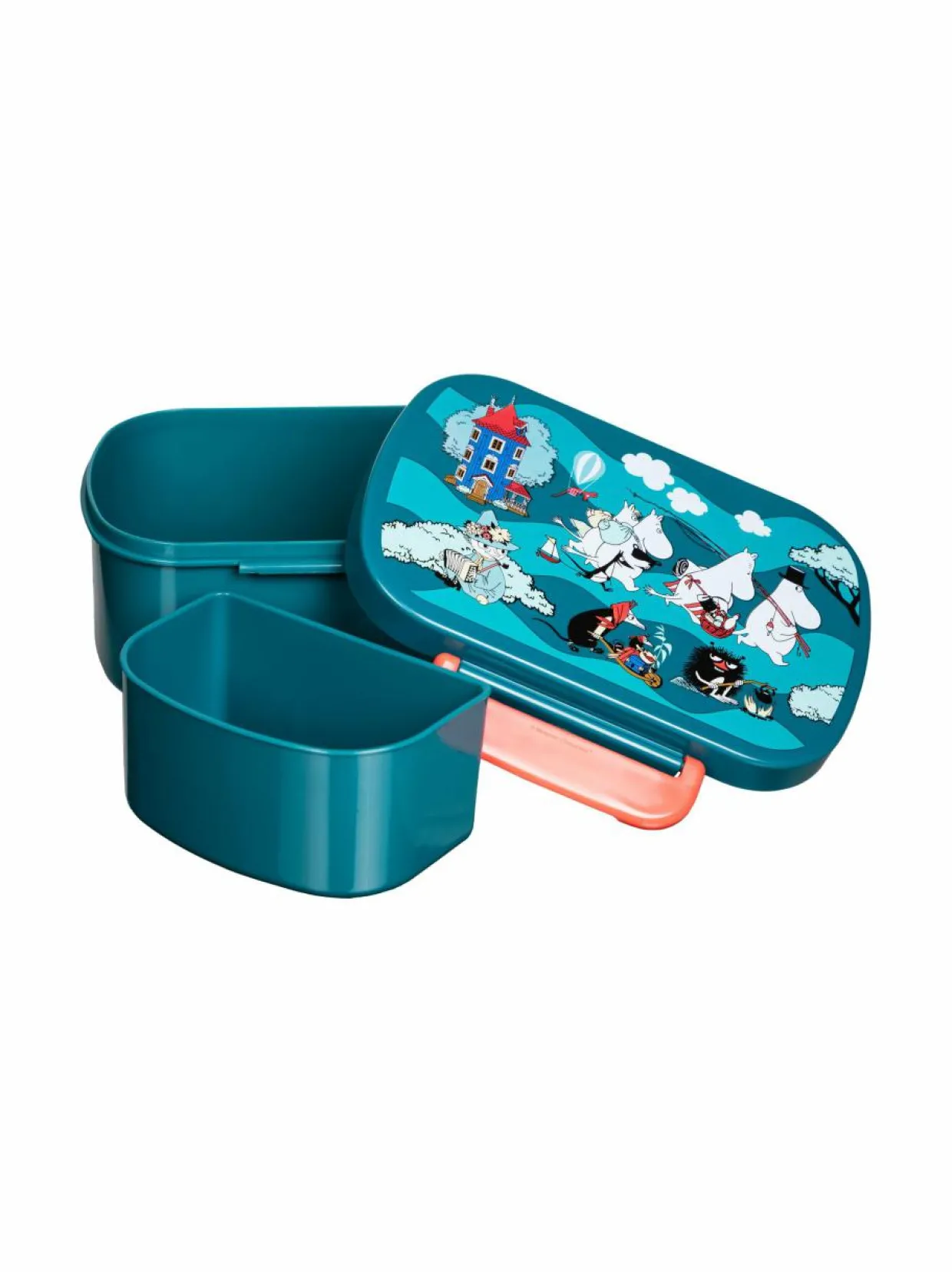 Käytännöllinen eväsrasia välipaloille tai lounaalle. Lounaslaatikon kannessa on kuva Muumeista palaamassa kotiin Muumitaloon yhdeltä seikkailultaan. Eväslaatikon sisäpuolella on erillinen lokero esimerkiksi marjoja varten. Lokero on tarvittaessa helposti irrotettava.