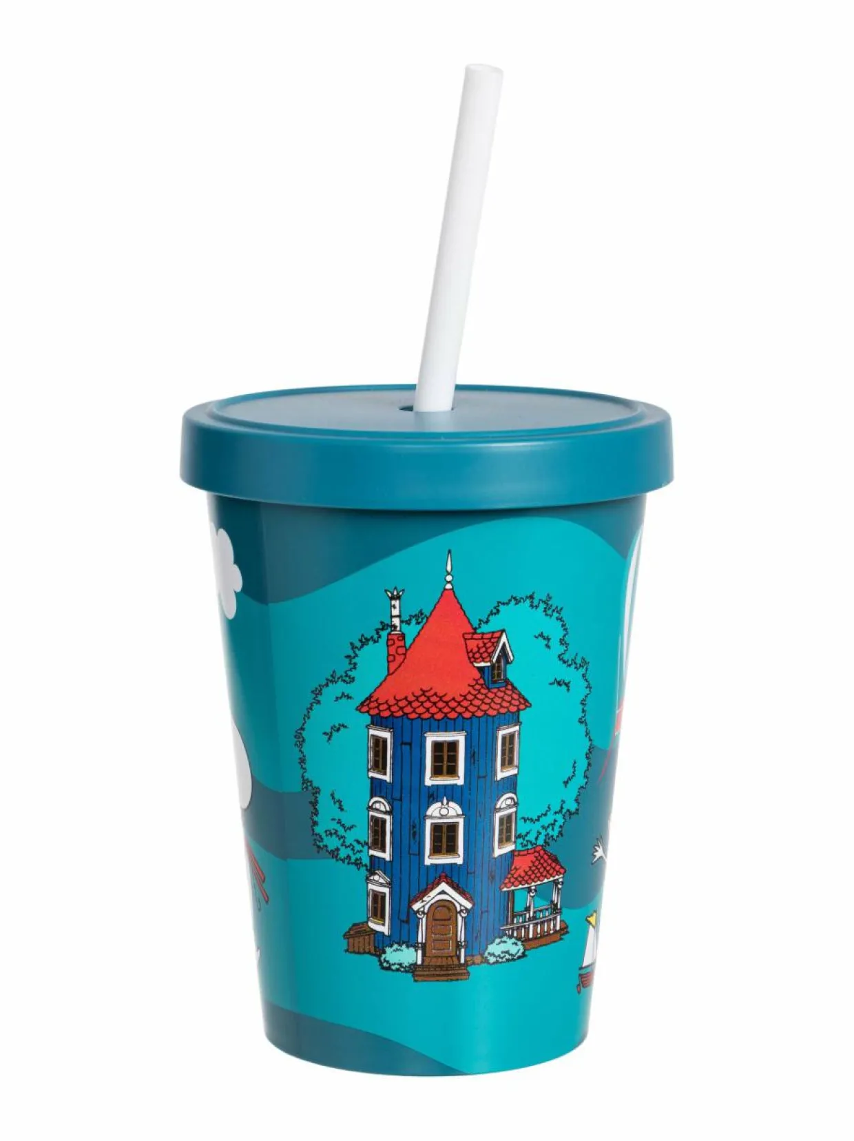 Muumi-muki Kotipiha-kuviolla. Siinä on pilli sekä kansi ja mukin tilavuus on 4,5 dl. Tämä pillimuki sopii lämpimille juomille (70 °C). Kansi ei ole täysin tiivis pillin ympärillä, mutta pillin toisessa päässä on pieni rengas, joka estää pillin putoamisen.
