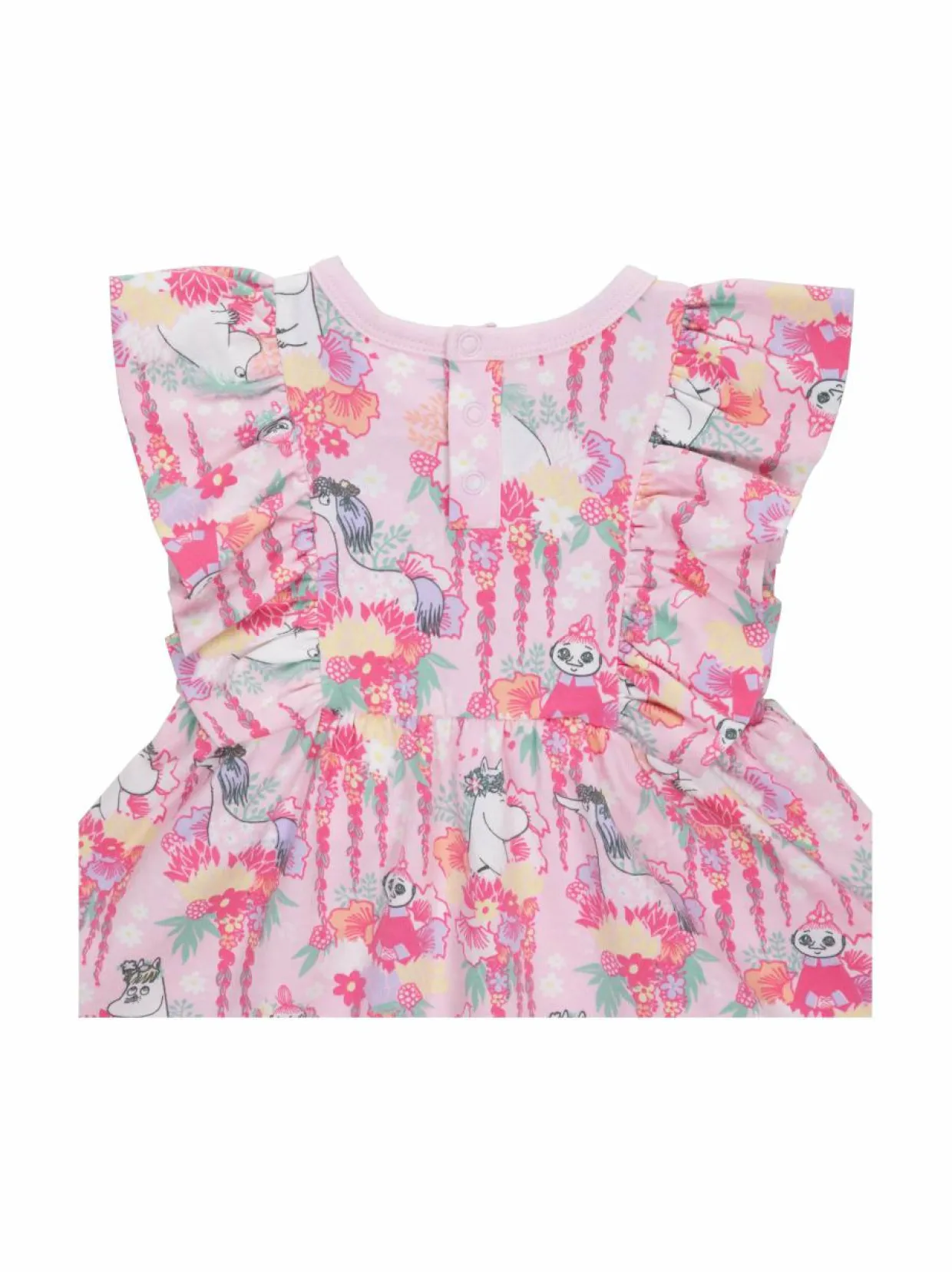 Ihastuttava kesäinen frillamekko vauvoille. Nepparit on sijoitettu mekon selkäosaan. Muumi Kukkaseppele -mekko on valmistettu pehmeästä luomupuuvillasta, johon on lisätty elastaania tuomaan joustoa.