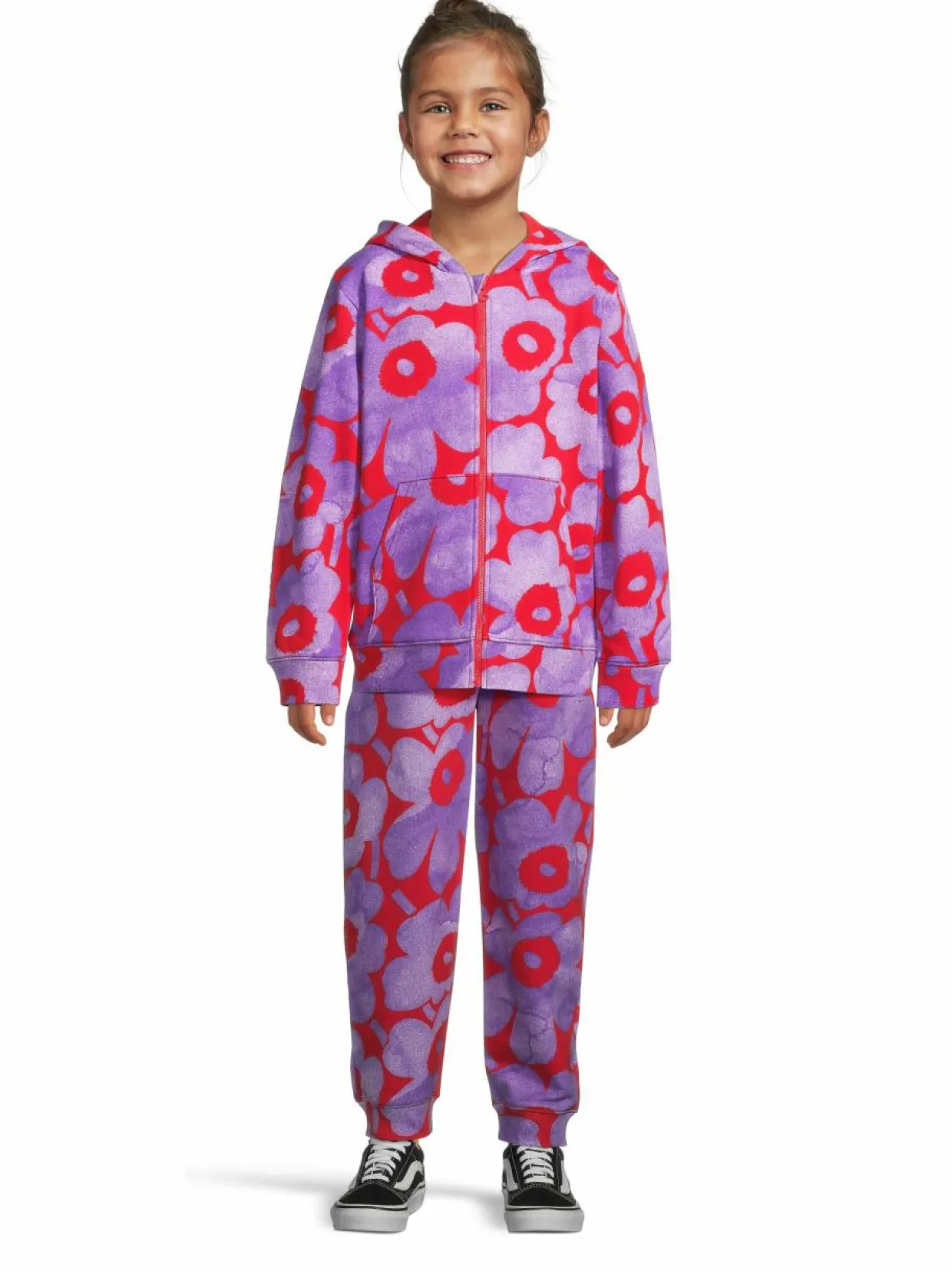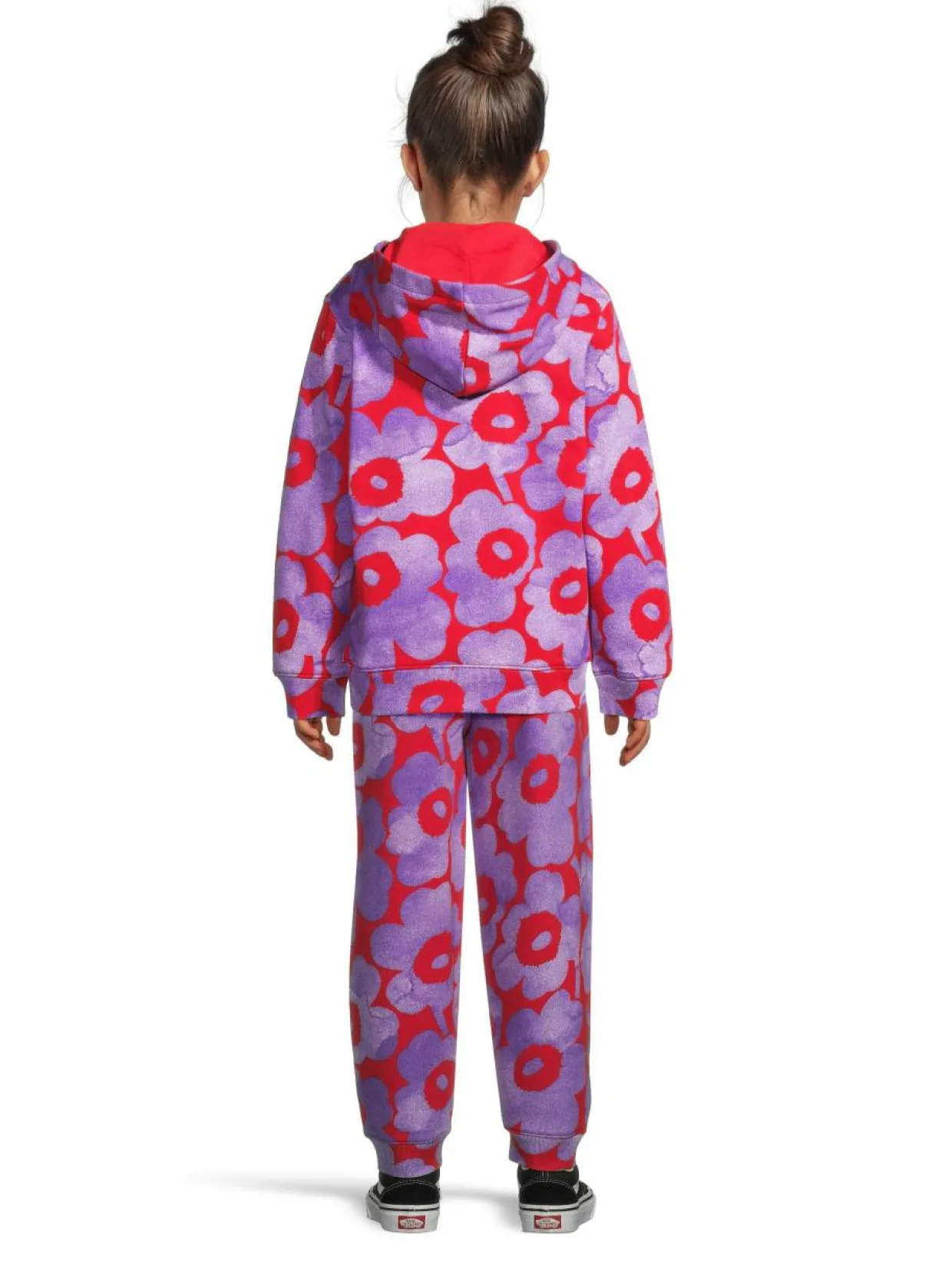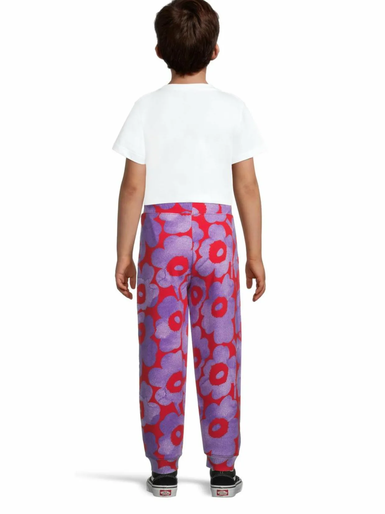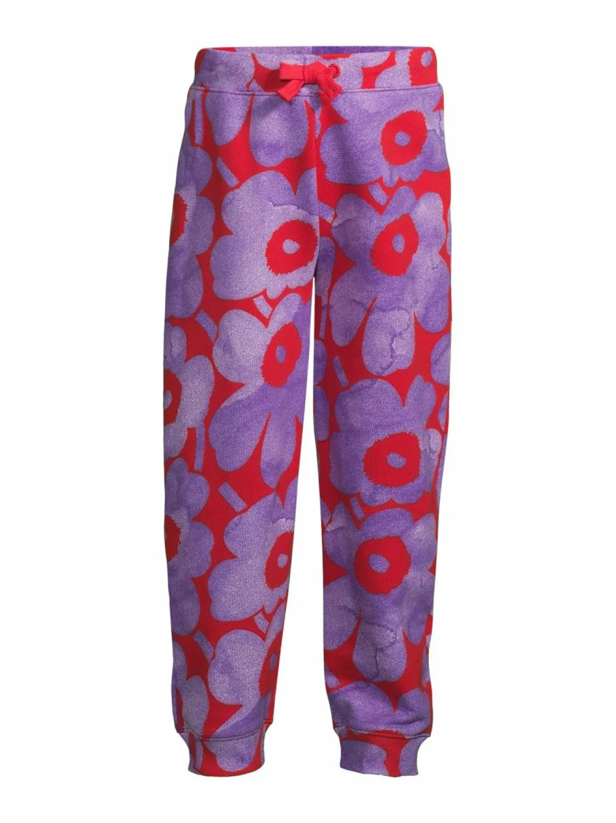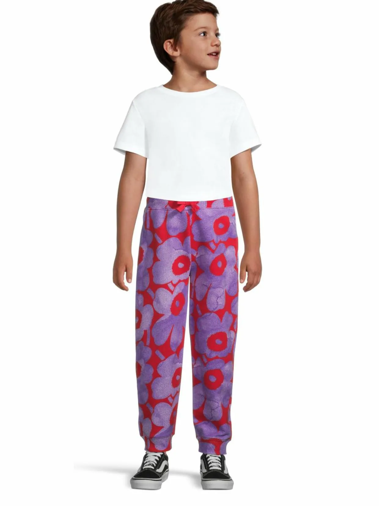 Marimekon lasten Laakeri-collegehousut on valmistettu pehmeästä luomupuuvillasta ja niissä on rento istuvuus. Housuissa on Akvarelli Unikko -kuosi, joka näyttää siltä kuin se olisi maalattu vesiväreillä. Verryttelyhousuissa on joustinneulos vyötäröllä, jossa on kuminauha sekä kiristysnyöri. Lahkeensuissa on myös joustinneulosta. Marimekon kuuluisa Unikko-kuosi syntyi vuonna 1964, jolloin designtalon mallistoissa oli enimmäkseen abstrakteja kuoseja. Suunnittelija Maija Isola halusi luoda tästä orgaanisesta teemasta jotain mielenkiintoista ja suunnitteli kokonaisen sarjan kukkakuoseja. Nykyään ikoninen kukka edustaa luovuutta.