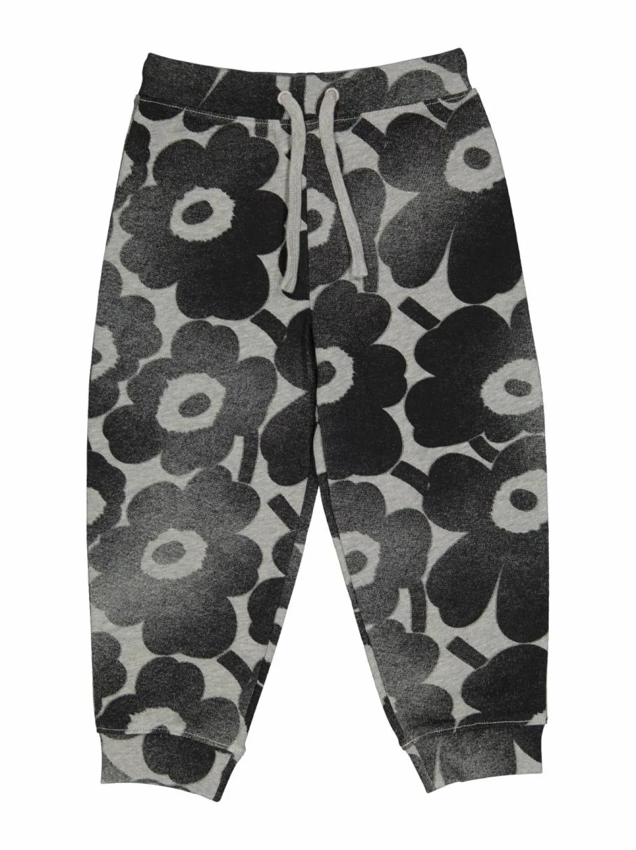 Lasten Laakeri-collegehousut on valmistettu meleeratusta luomupuuvillacollegesta ja niissä on rento istuvuus. Housuissa on Unikko-kuosi ja vyötäröllä on resori, jonka sisällä kulkee kuminauha sekä kiristysnauhat. Lahkeissa on leveät resorit.