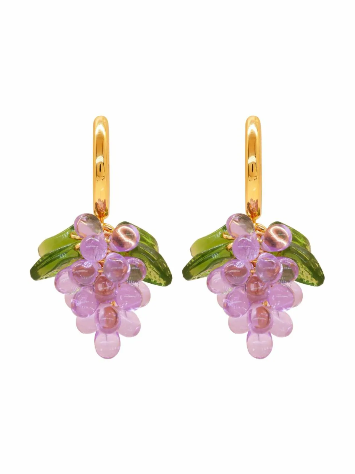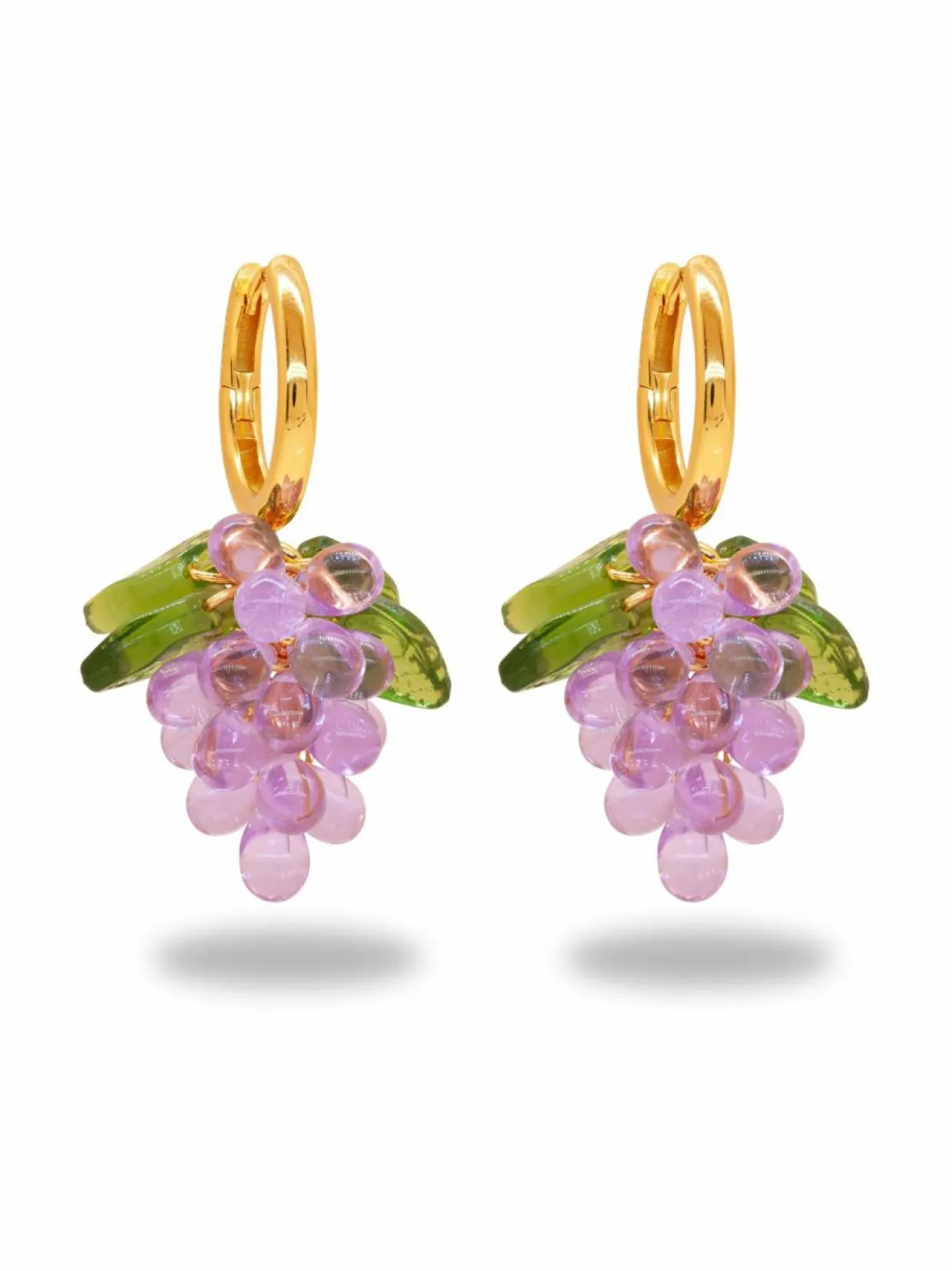 Lavender Jelly -korvakoruissa on 18k kullalla päällystetyt 925 sterling-hopearenkaat, lasihelmiä ja akryylilehdet. Lasihelmet ovat kiinni korussa kullatuilla messinkirinkuloilla.Korut valmistetaan käsityönä Suomessa.