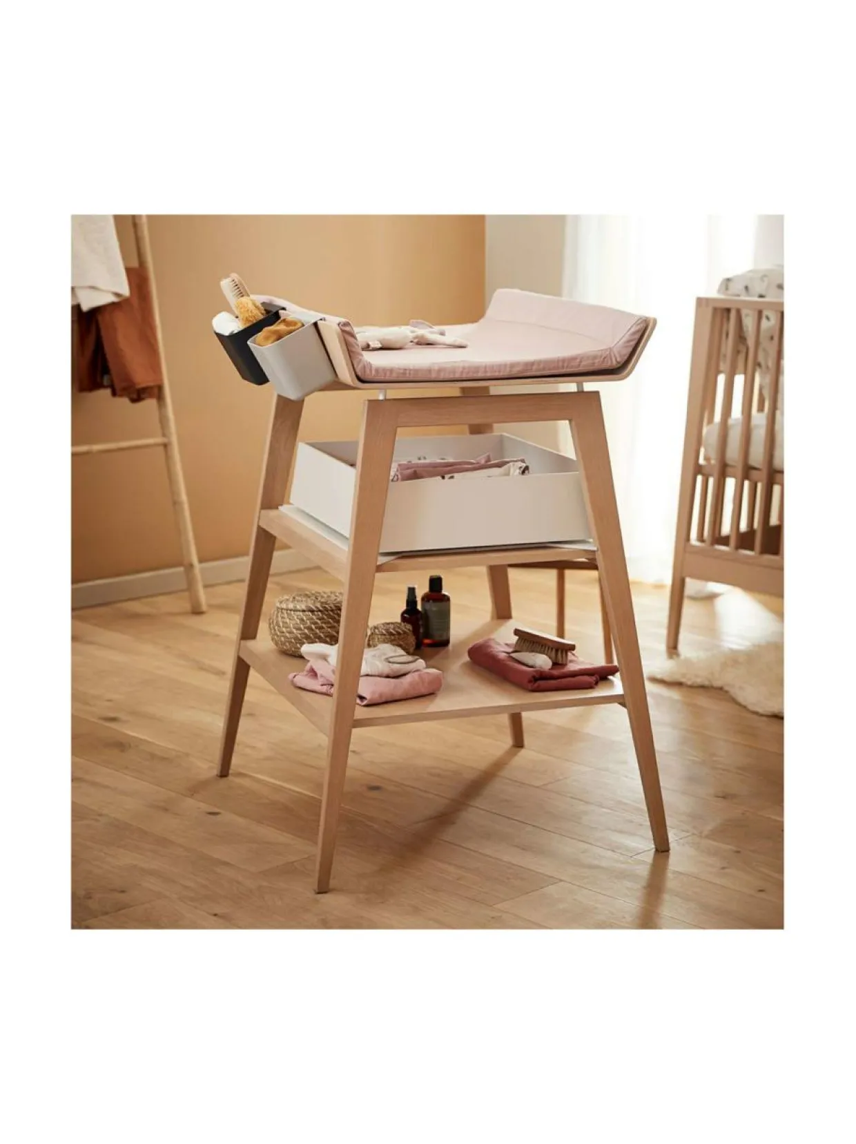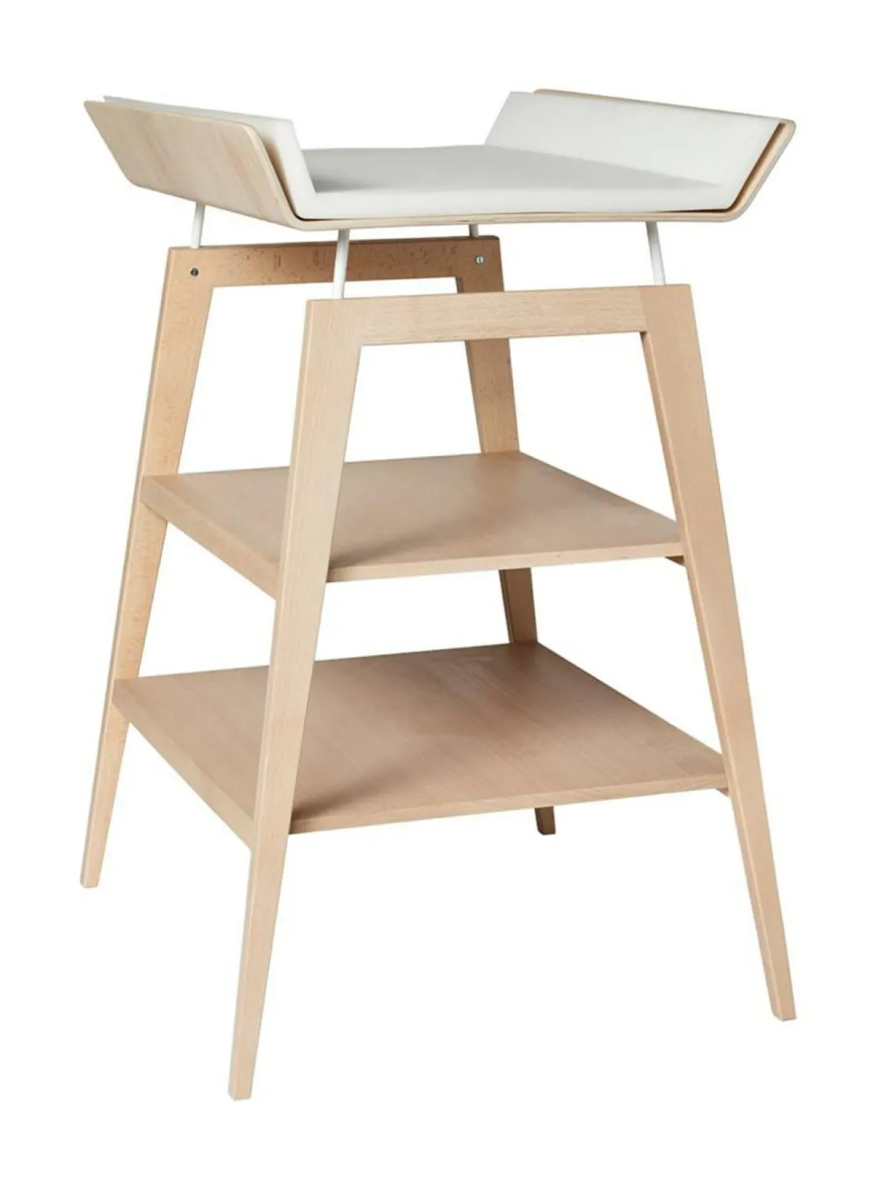 Leanderin Linea-hoitopöydällä vaipanvaihto sujuu mukavasti ja ergonomisesti. Pöydässä on lisäturvaa tuovat, korkeat laidat sekä säädettävät jalat, jotka voi asettaa sopivalle korkeudelle vanhemman pituuden mukaan. Pöydässä on kaksi hyllytasoa, joille mahtuvat kaikki tarpeelliset vaipanvaihtotarvikkeet. Tämä skandinaavista muotoilua ja käytännöllisyyttä yhdistävä hoitopöytä sopii erinomaisesti tyylitajuisille vanhemmille!