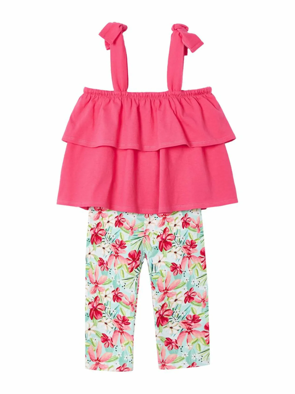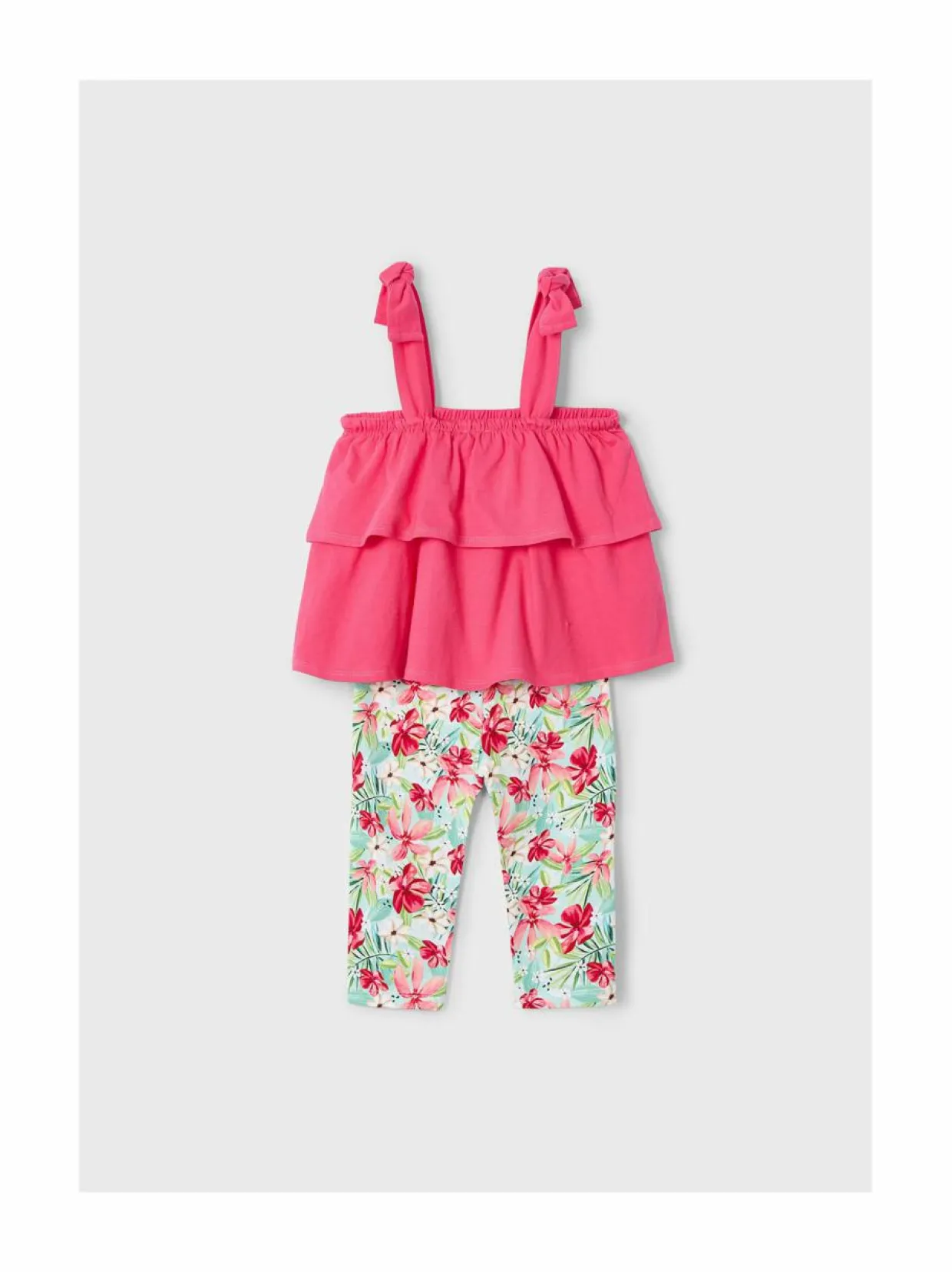 Mayoralin pakkaukseen kuuluu kaksi osaa: Rypytetty toppi sekä leggingsit. Topissa on leveät olkaimet ja solmut. Leggingseissä on kaunis kukallinen kuvio ja niiden vyötäröllä on joustava kuminauha. Vaatteet on valmistettu pehmeästä ja miellyttävästä puuvillatrikoosta. Ne ovat hengittävät ja helppohoitoiset.