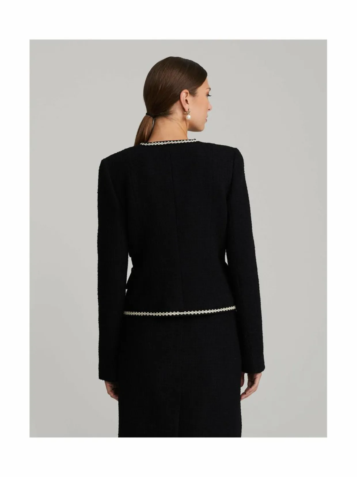 Klassinen Chanel-henkinen bleiseri, jossa pyöreä pääntie ja neljä valetaskua edessä. Kontrastiväriset yksityiskohdat lisäävät tyylikkyyttä ja luksusta. Helppo yhdistää erilaisiin toppeihin ja paitoihin sekä hameisiin ja housuihin. Materiaali on ylellistä villa-mohairsekoitetta.