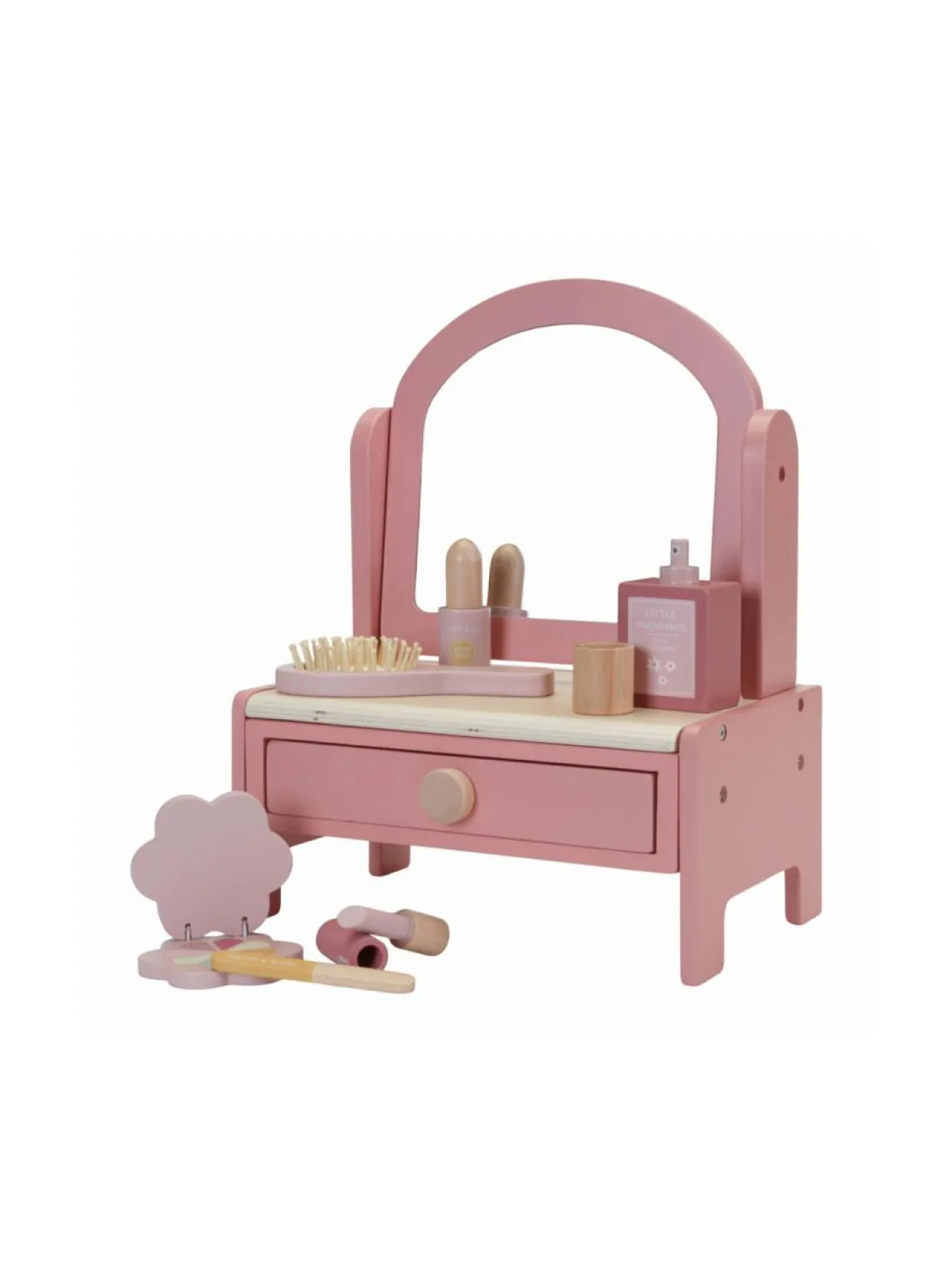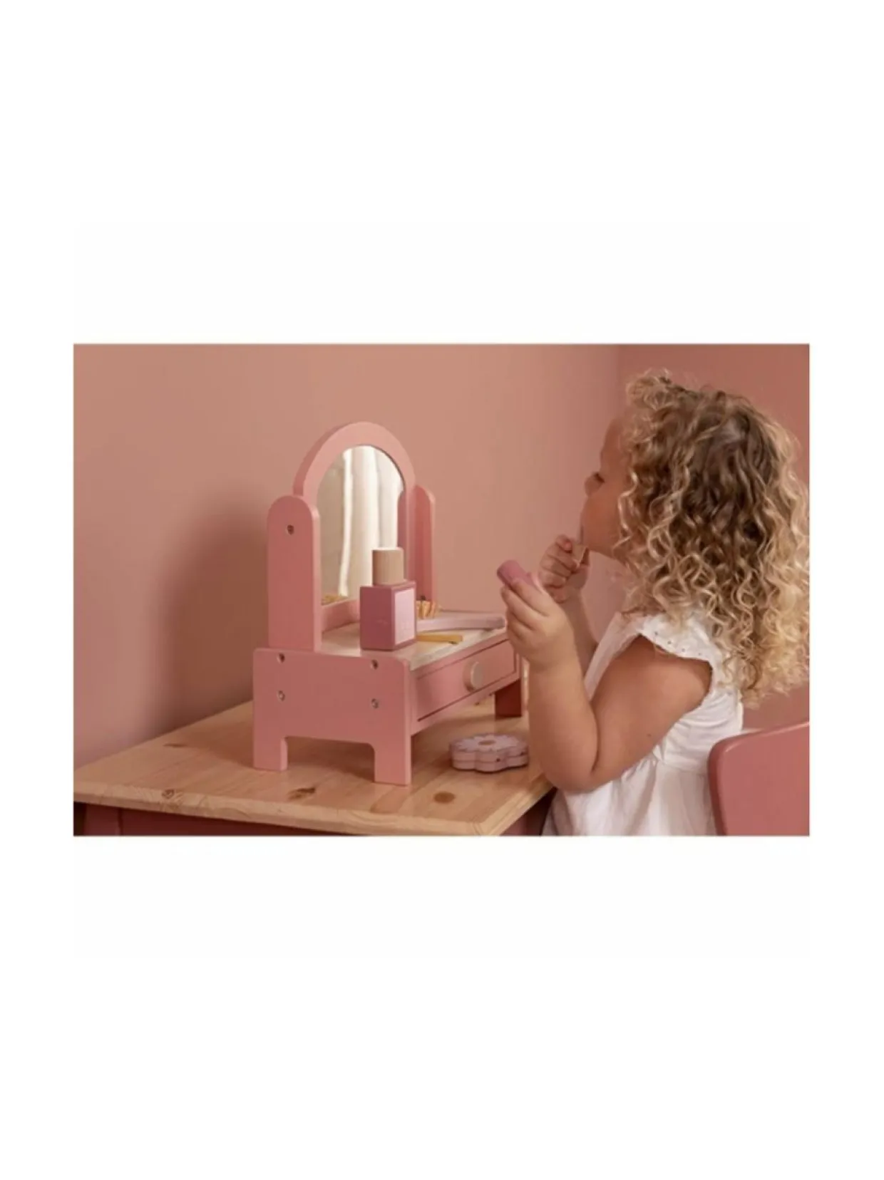 Little Dutch puinen kauneuspöytä on kauniin näköinen meikkipöytä, jonka mukana tulee puisia kauneustarvikkeita. Pöydässä on vetolaatikko tarvikkeita varten, sekä kääntyvä peili, joka on valmistettu akryylisestä hopeakalvosta. Kauneuspöytä kehittää lapsen mielikuvitusta.Lisätietoja: