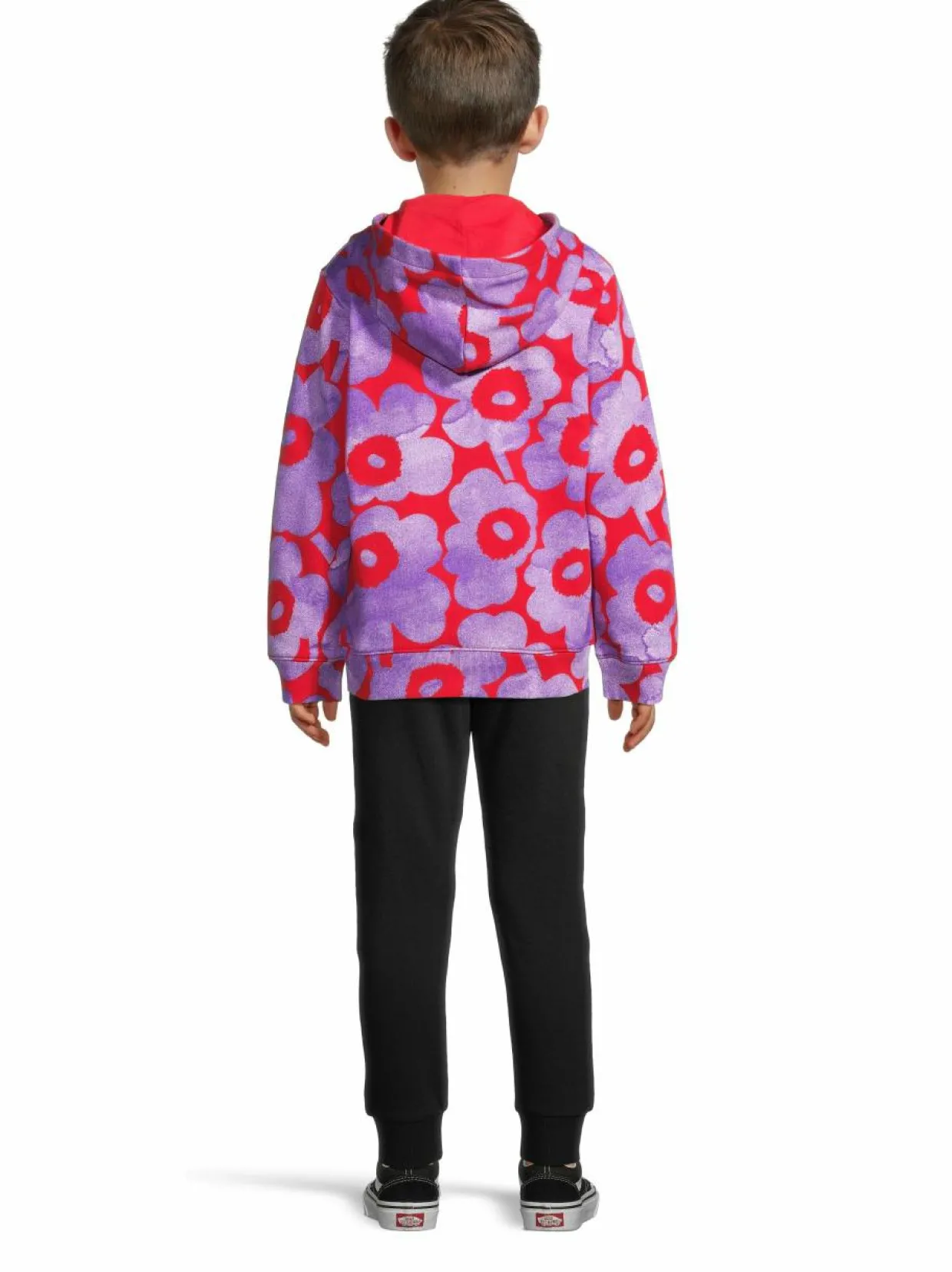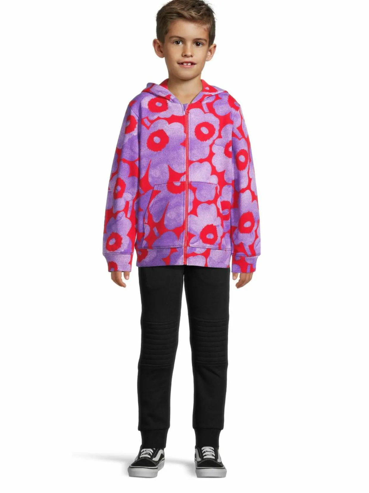 Marimekon lasten Logot-hupparitakki on valmistettu pehmeästä luomupuuvillasta ja siinä on rento istuvuus. Hupparissa on Akvarelli Unikko -kuosi, joka näyttää siltä kuin se olisi maalattu vesiväreillä. Siinä on vetoketjukiinnitys leukasuojalla ja edessä paikkataskut. Hihansuissa ja helmassa on napakat resorit. Marimekon kuuluisa Unikko-kuosi syntyi vuonna 1964, jolloin designtalon mallistoissa oli enimmäkseen abstrakteja kuvioita. Suunnittelija Maija Isola halusi luoda tästä orgaanisesta teemasta kuitenkin jotain mielenkiintoista ja suunnitteli kokonaisen sarjan kukkakuoseja. Nykyään ikoninen kukka edustaa luovuutta.