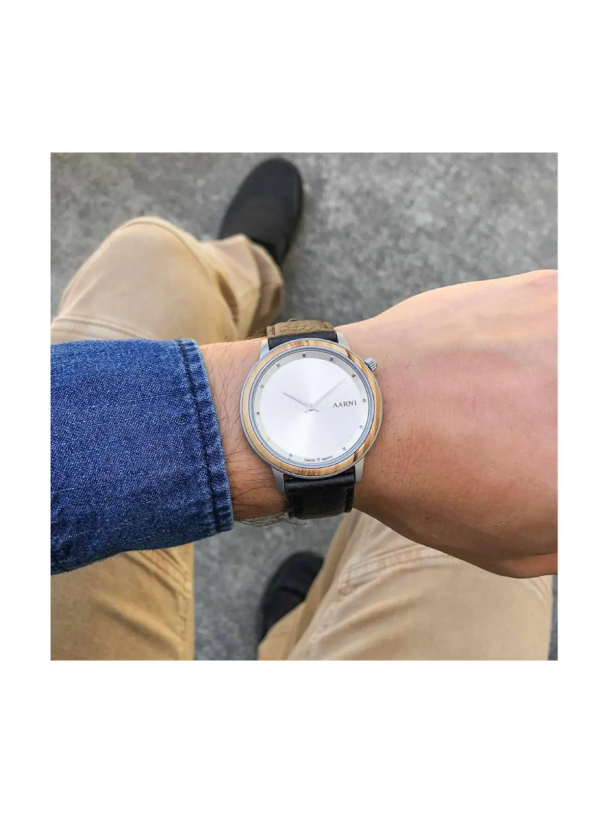 Ajatonta ja tyylipuhdasta arvokkuutta. Aarni Loihi on klassisen tyylikäs rannekello, jota kehystää oliivipuinen reunus. Kokonaisuuden täydentää kotimaisesta hirvennahasta valmistettu ranneke, joka hurmaa pehmeydellään. Kellon sydämenä toimii tarkka ja laadukas sveitsiläinen ETA-koneisto.