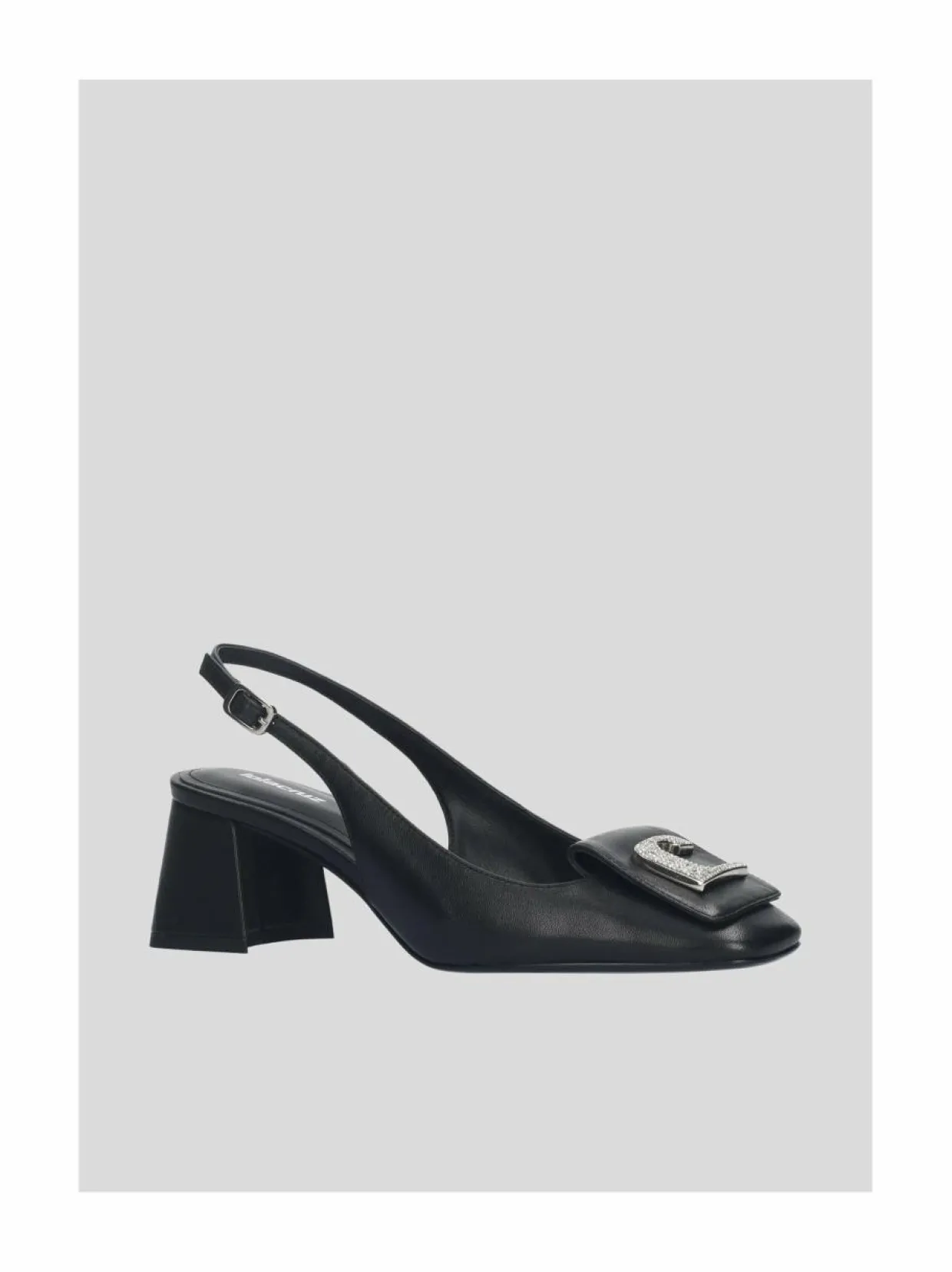 Minimalistiset nahkaiset avokkaat 5,5 cm:n lohkokoroilla. Säädettävä slingback-remmi takaa hyvän istuvuuden. Kärjet ovat neliömäiset ja logomerkillä koristeltu päällinen antaa viimeisen silauksen.