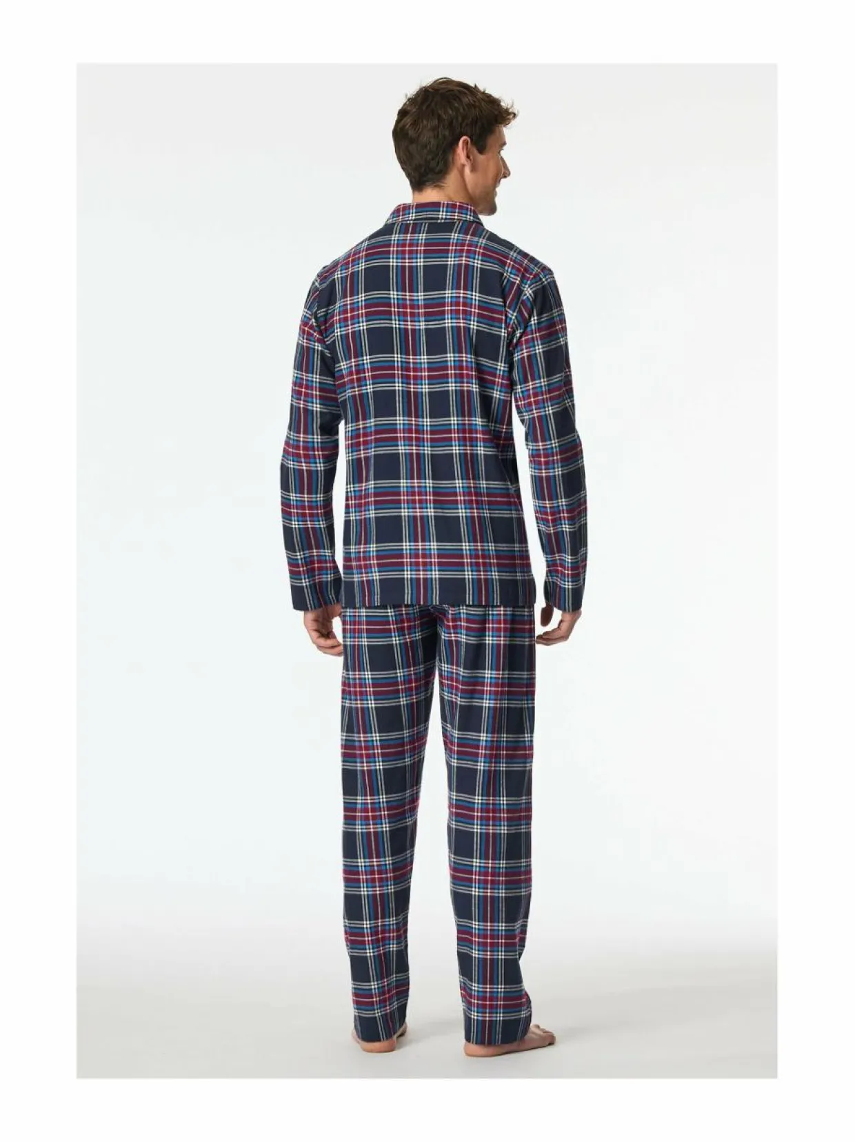 2-osainen klassinen pyjama ruutukuosissa. Settiin kuuluu napitettu pyjamapaita rintataskulla ja suoralahkeiset taskulliset housut säädettävällä ja joustavalla vyötärölinjalla. Materiaalina on käytetty pehmeän tuntuista puuvillaflanellia.