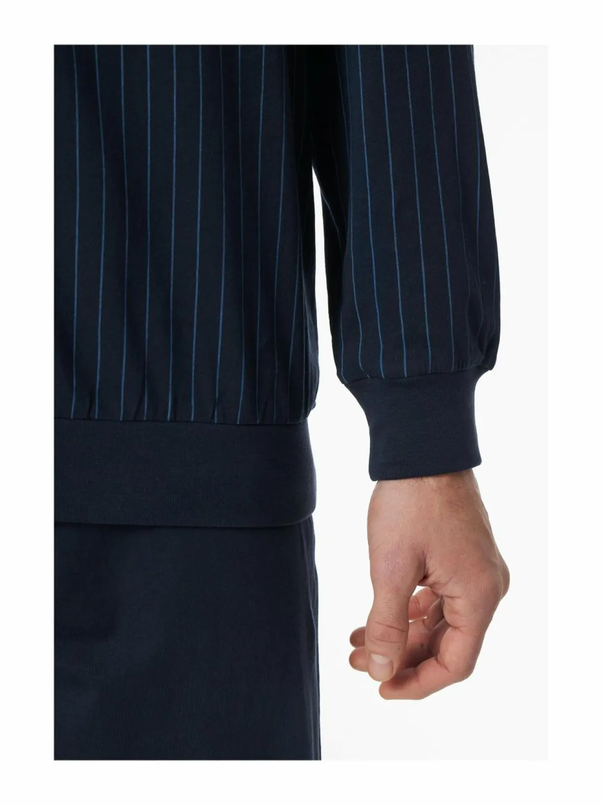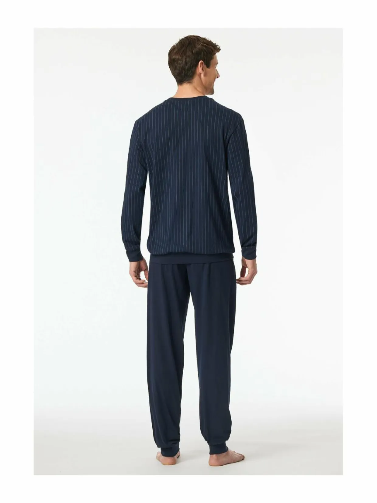 Schiesserin täyspitkä pyjama koostuu raidallisesta pyjamapaidasta ja yksivärisistä pyjamahousuista. Setti on valmistettu pehmeästä ja hengittävästä puuvillasta. Tämä oloasu sopii täydellisesti rentoutumiseen ja nukkumiseen. Paidassa on rintatasku ja housuissa on mukavan joustava vyötärö.
