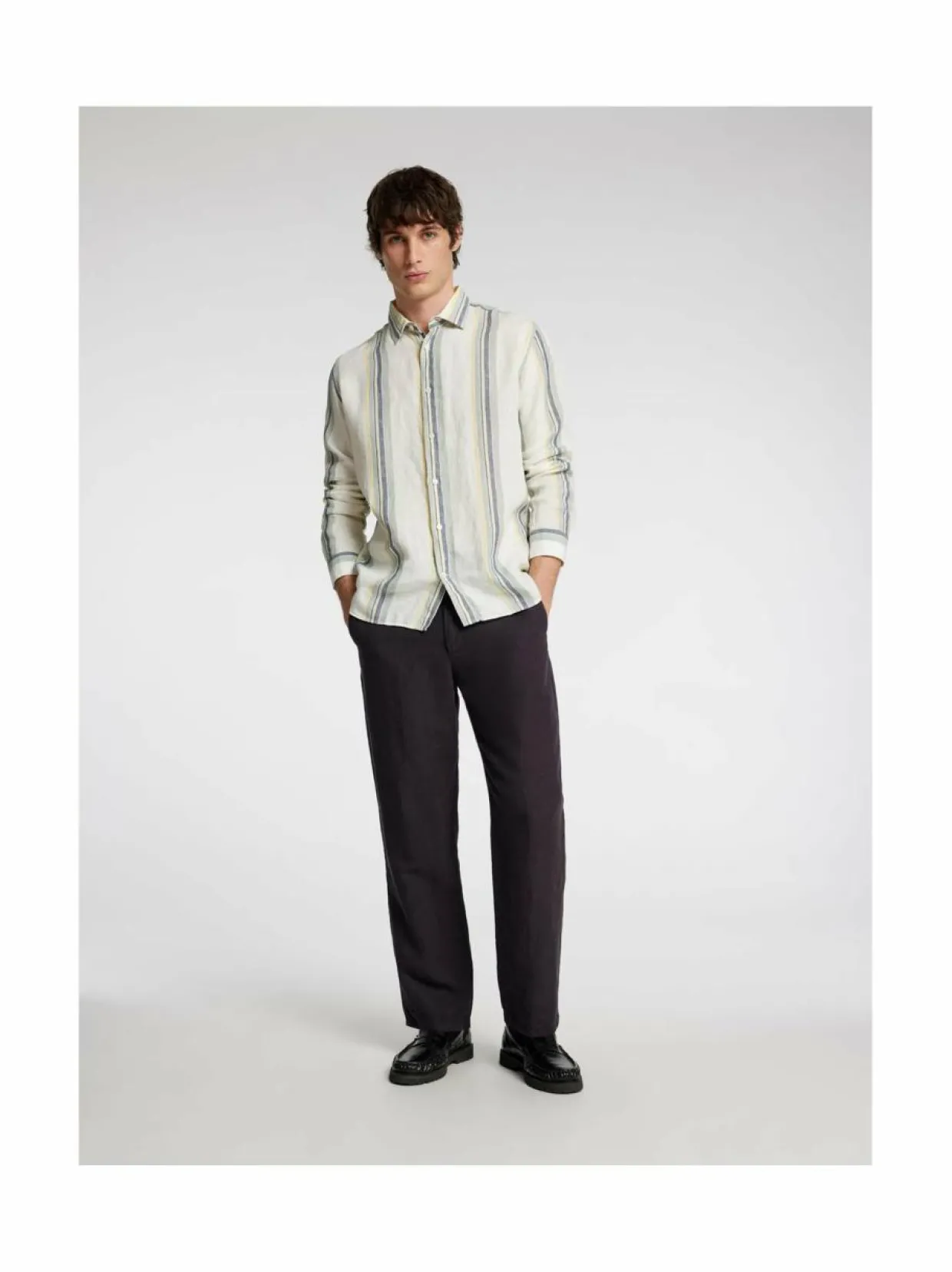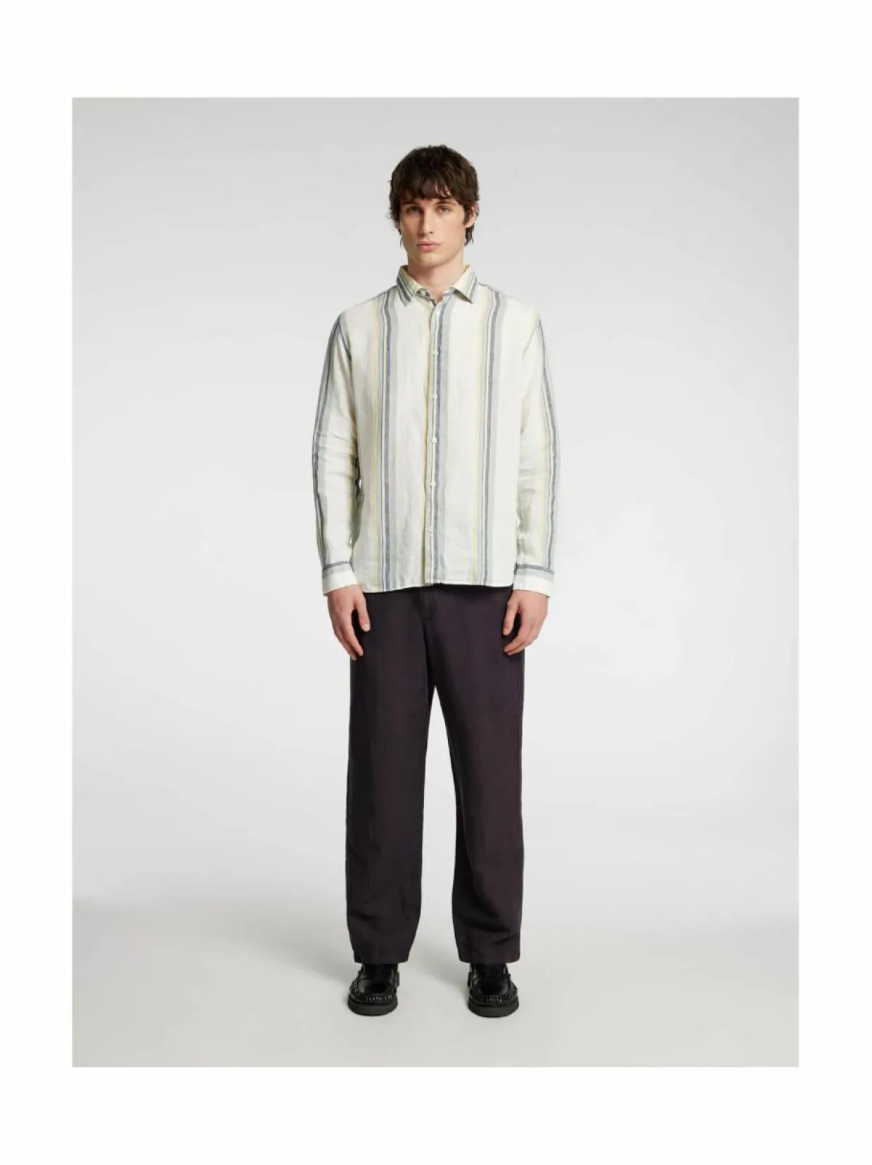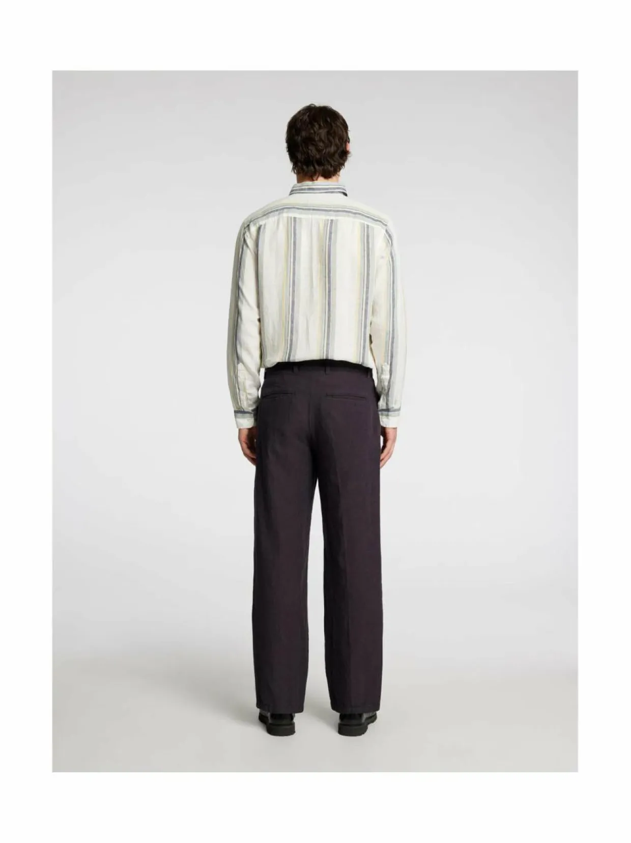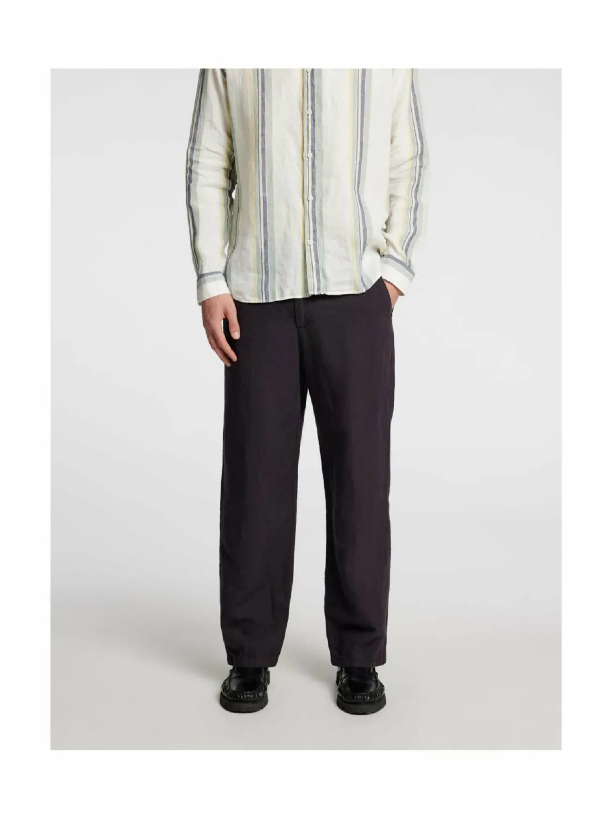 Loose Mads Sun -prässätyt housut on valmistettu pehmeästä pellavasta ja niissä on rento istuvuus. Housuissa on vetoketju ja napit edessä. Mallissa on kaksi sivutaskua ja kaksi takataskua. Ne on valmistettu 76 % pellavasta, 20 % kierrätetystä puuvillasta ja 4 % puuvillasta.