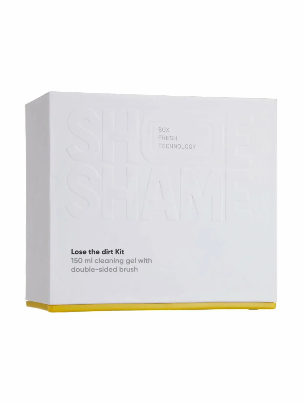 Shoe Shame Lose the Dirt Kit -kenkienhoitopakkaus sisältää Lose the Dirt -puhdistusgeelin sekä Brush it Off-puhdistusharjan. Pakkaukseen kuuluvaa muovialustaa voi käyttää vesiastiana.