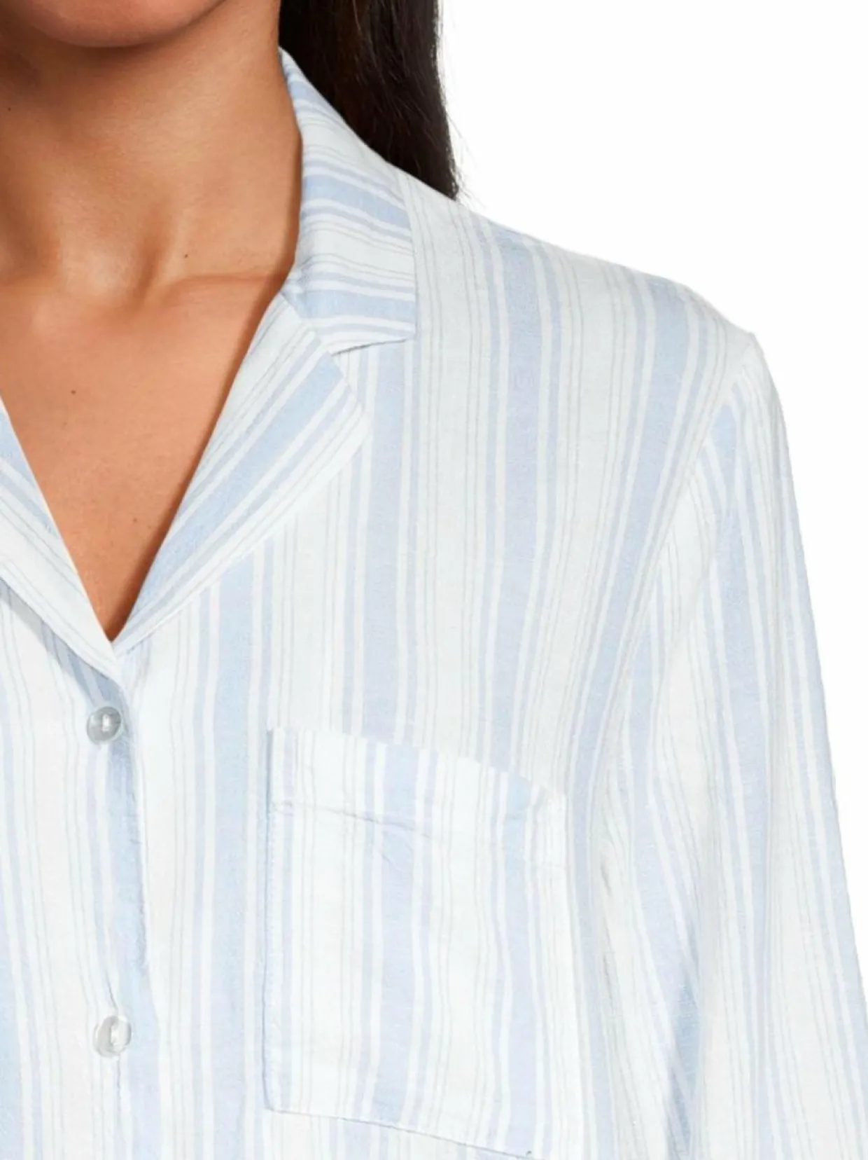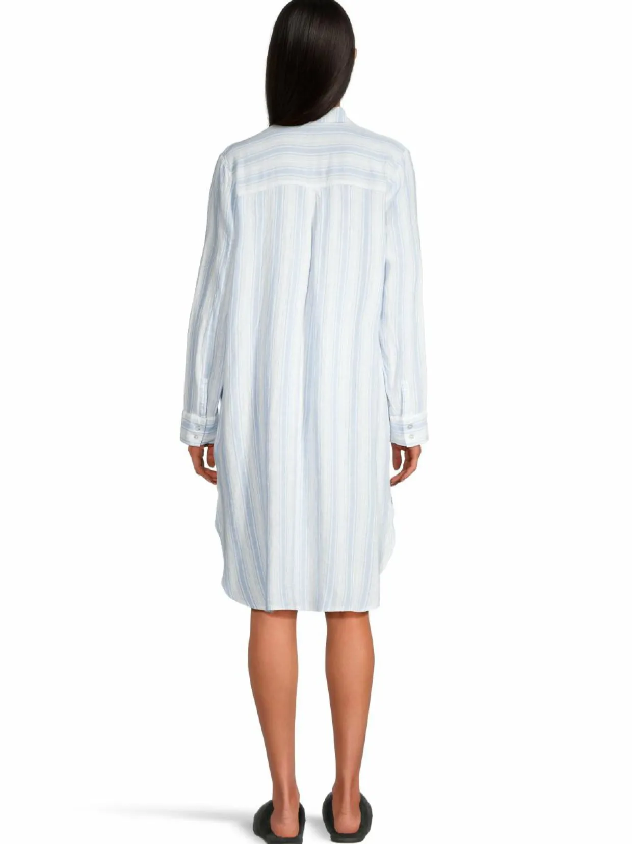 Stockmannin oman käyttövaatemalliston A+moren yöpaita on valmistettu pehmeästä pellava-viskoosista. Raidallinen Maggie-yöpaita toimii hyvin myös kevyenä paitamekkona hellepäivillä. Yöpaidan edessä on kokopitkä napitus. Vaate on suunniteltu rentoon istuvuuteen.