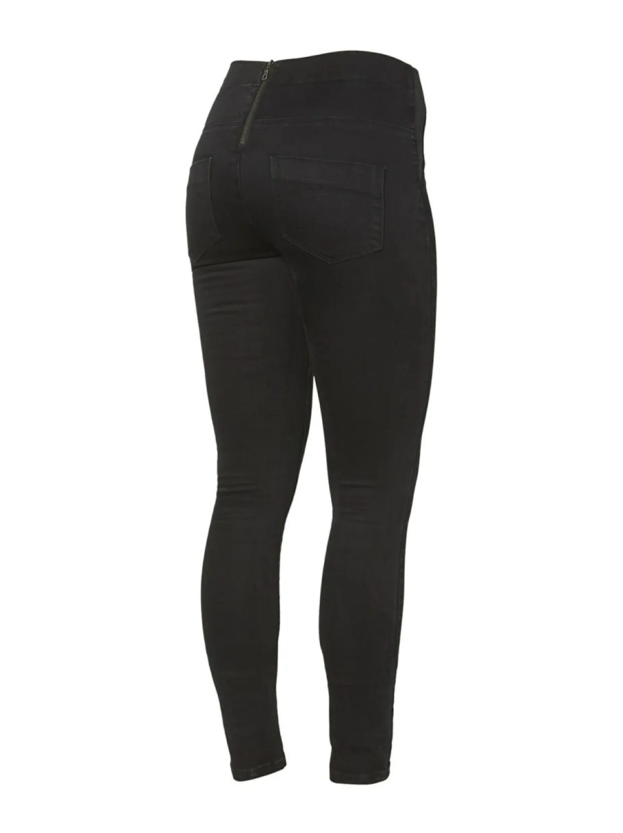 Mamalicious MlLola Slim Black Jeans housut on tarkoitettu käytettäväksi synnytyksen jälkeen. Housut ovat tyköistuvat, ne on valmistettu joustavasta materiaalista ja niissä on joustava sekä korkea vyötärö. Housujen takapuolella on takataskut ja näkyvä vetoketju, jolla housut saadaan kiinni.