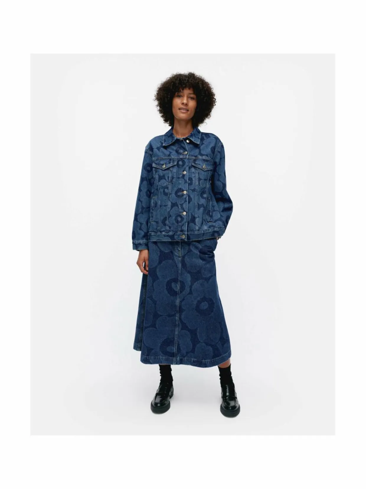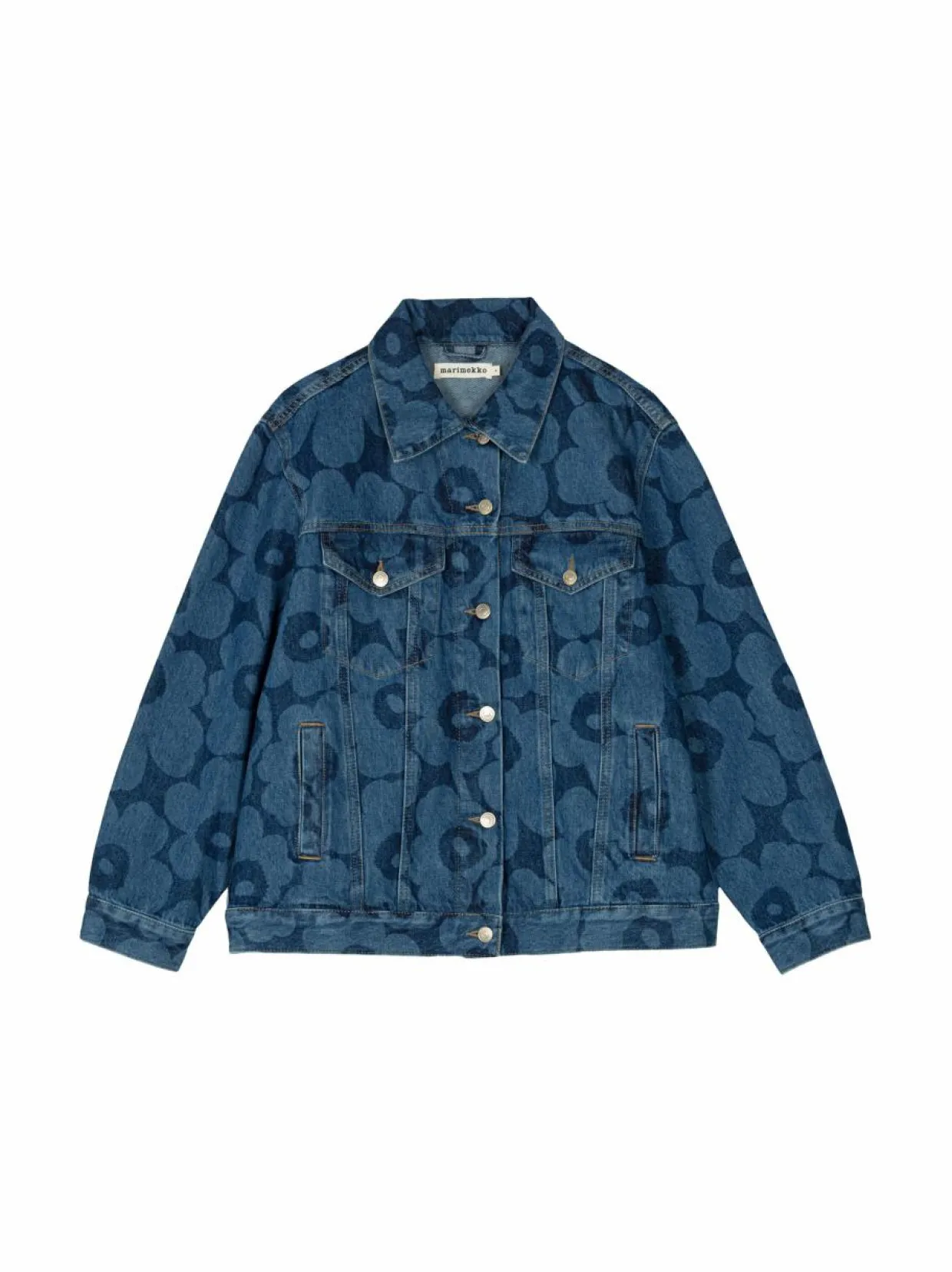 Marimekon Maridenim Murros Unikko -farkkutakki on valmistettu joustamattomasta puuvilladenimistä Unikko-kuosissa. Takissa on rento istuvuus, nappisuljenta, napilliset rintataskut ja sivutaskut. Hartialinja on madallettu rennon siluetin korostamiseksi.