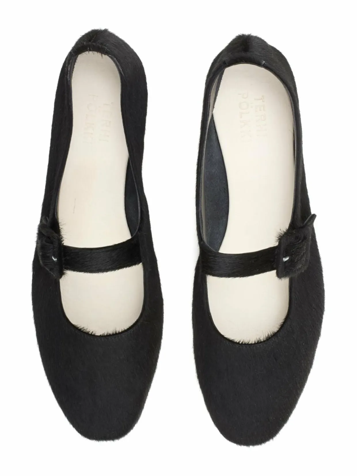 Klassiset Mary Jane -kengät on valmistettu vasikannahasta, ja niissä on solkikiinnitys. Kevyt nahkapohja lisää eleganssia ja käyttömukavuutta. Tyylikäs ponin karva viimeistelee kokonaisuuden.