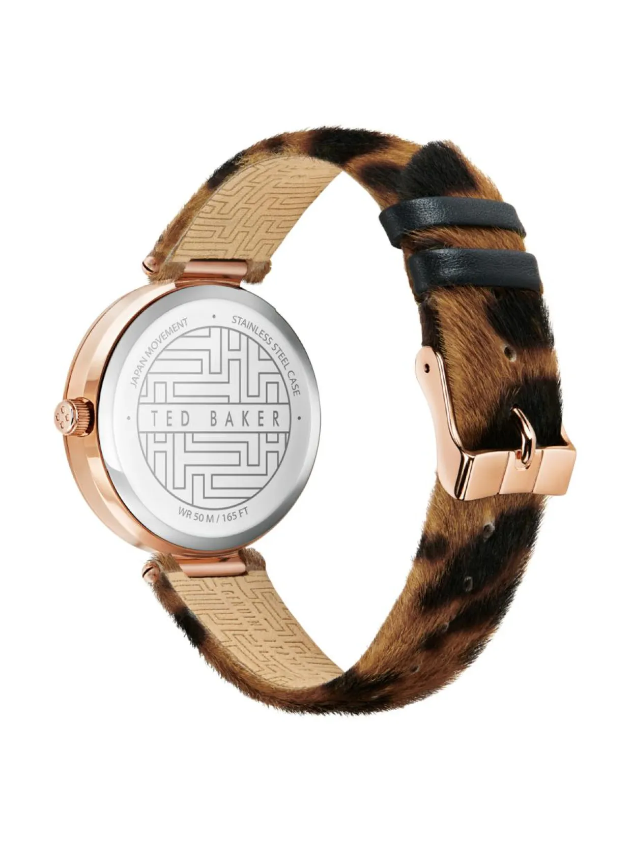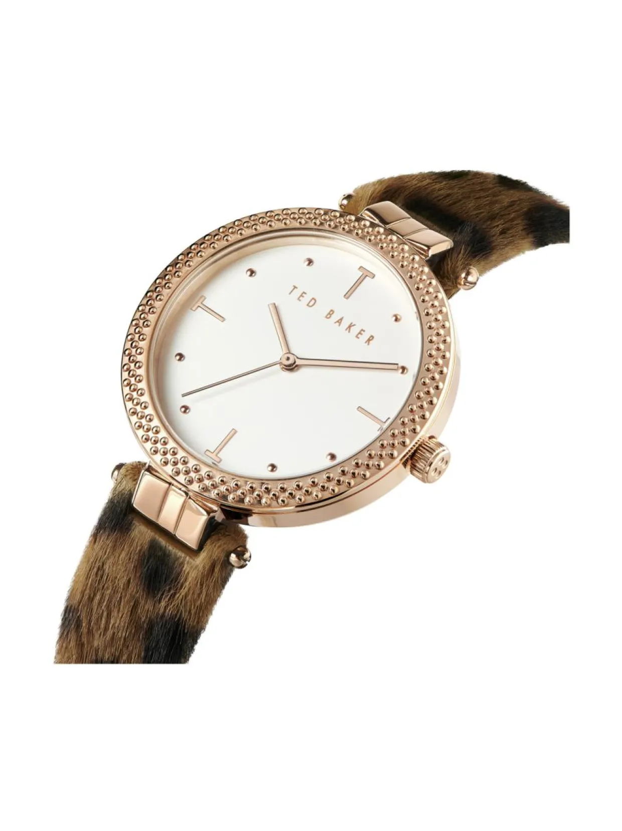 Ted Baker Mayfr 36mm rannekello hurmaa yksityiskohdillaan. Kellon ruusukullanvärinen runko on valmistettu ruostumattomasta teräksestä. Sen leveys on 36mm ja paksuus on 8mm. Rannekkeena tässä mallissa on leopardinvärinen nahkaranneke. Rannekkeen kiinnityskohdassa on rusetti. Valkoisessa taulussa on ruusukullanväriset pyöreät indeksit ja Tedin T jokaisen neljännestunnin kohdalla. Kellossa on mineraalilasi ja kvartsikoneisto. Kellon vesitiiviys on 5ATM. Ted Baker kelloilla on 2 vuoden takuu.