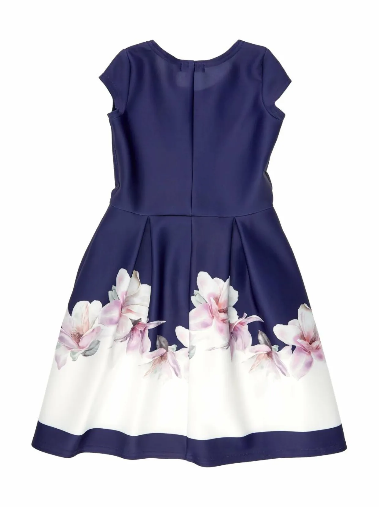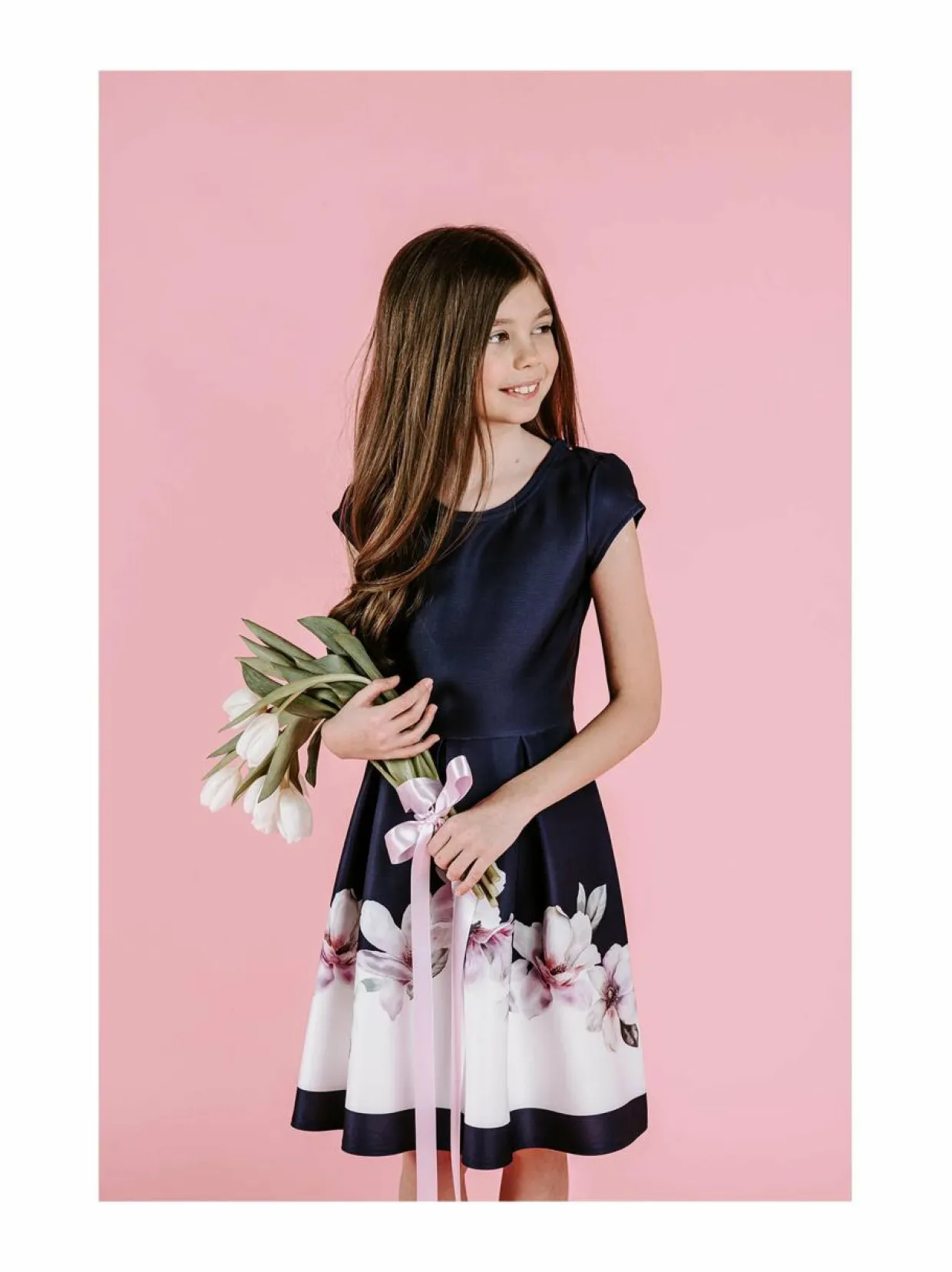 Lyhythihainen Mingnelin-mekko on valmistettu miellyttävän pehmeästä ja joustavasta scuba-materiaalista, se on helppo pukea päälle ja se tuntuu mukavalta käyttää. Rypistymätön ja hyvin venyvä kangas pysyy hyvin muodossaan. Mekon helmaa koristaa kaunis magnoliaboordi.