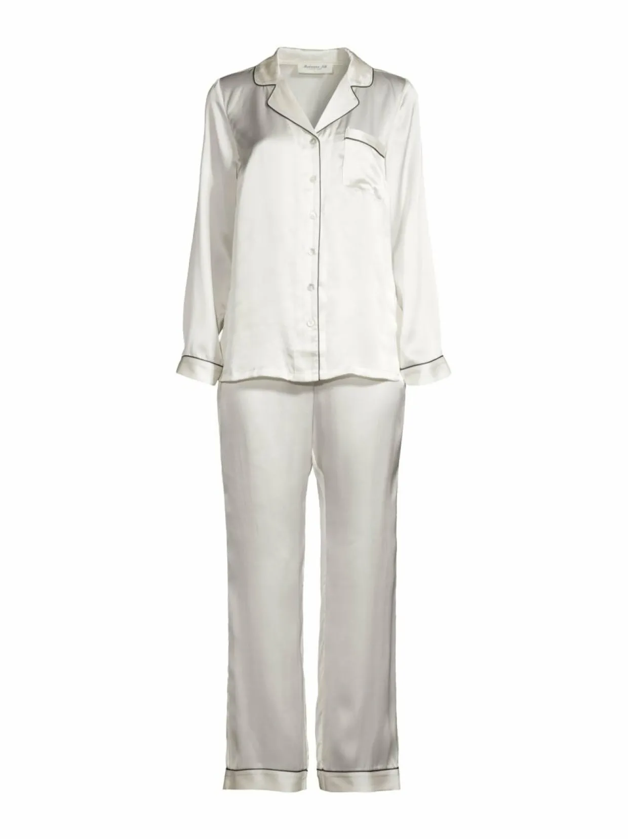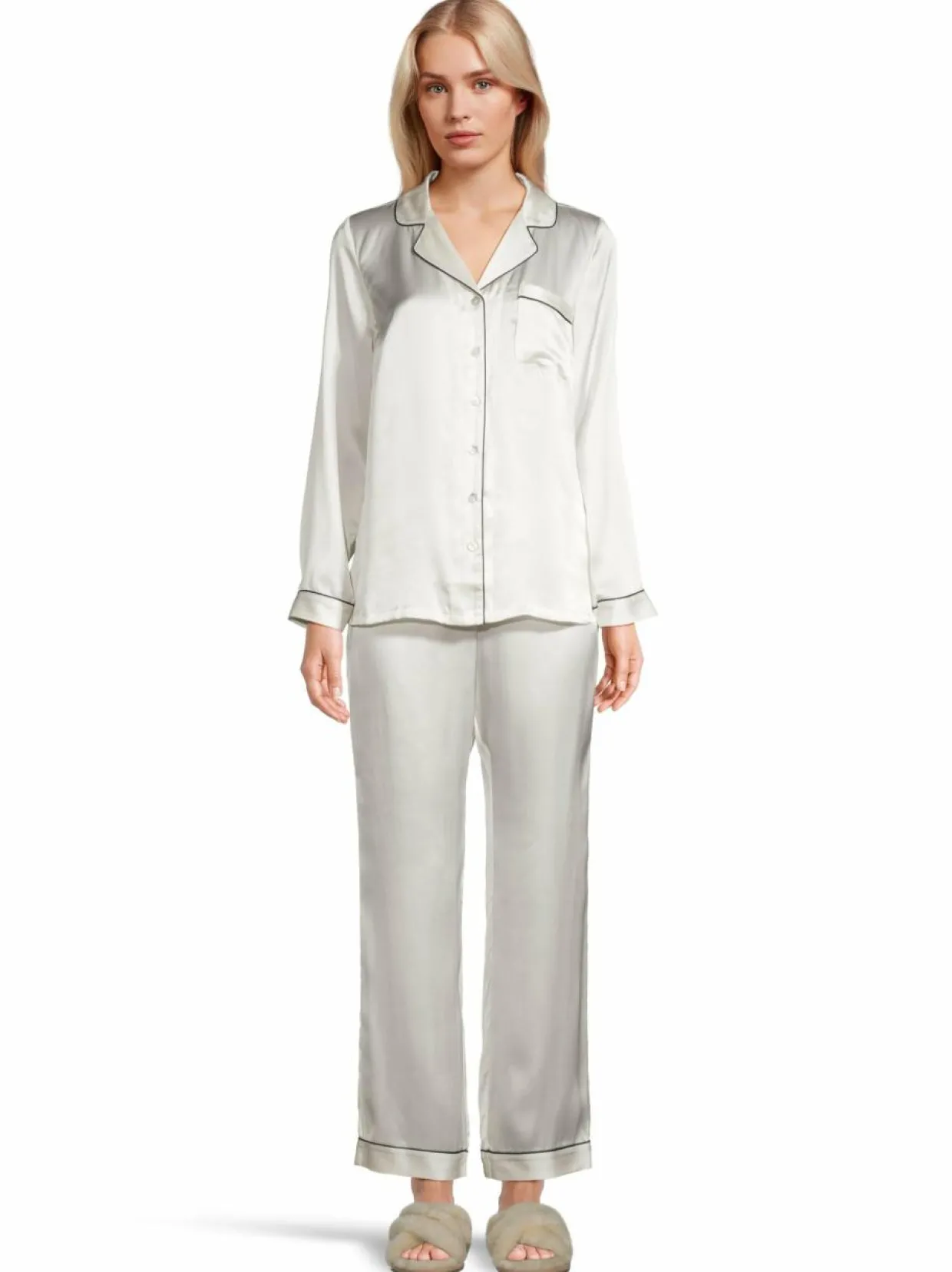 Ylellisestä silkkisatiinista valmistettu setti, johon kuuluu yöpaita ja yöhousut.