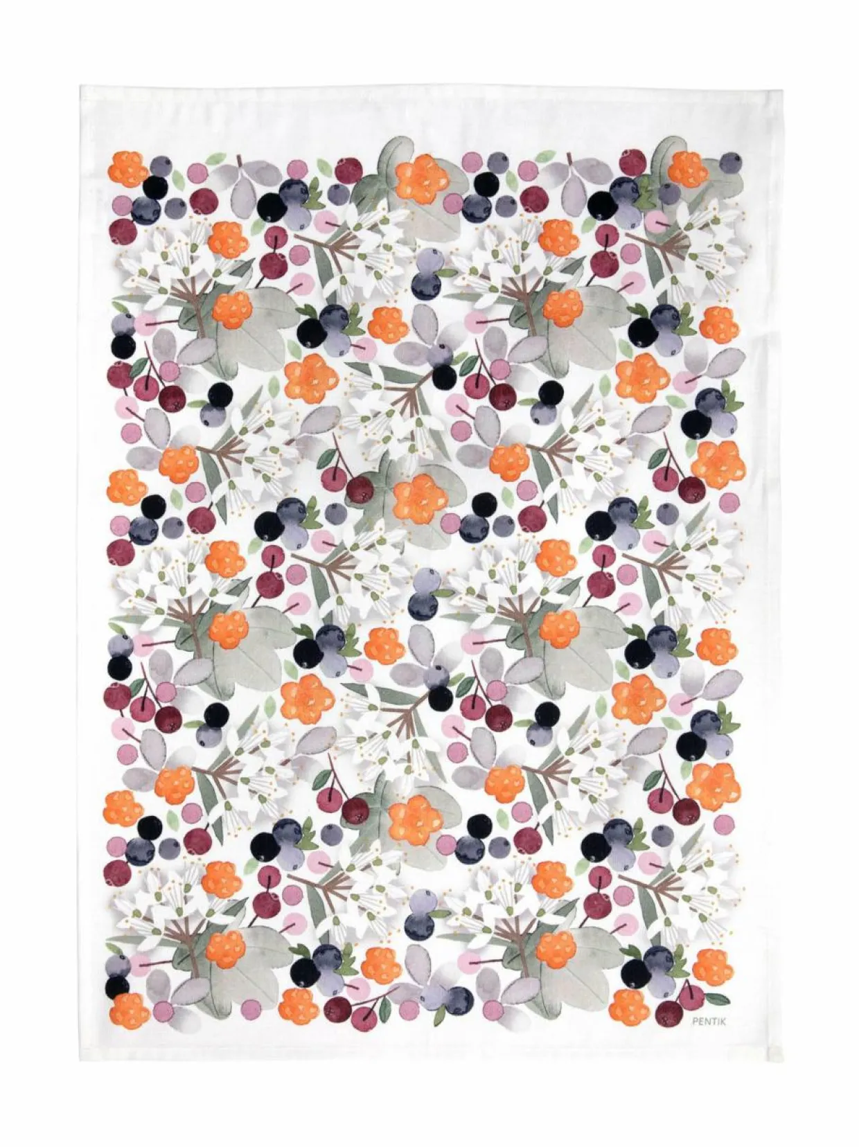 Pentik Metsämarja -keittiöpyyhe tuo ripauksen pohjoisen luontoa keittiöön. Lasse Kovasen suunnittelemaan, vesiväritekniikalla syntyneeseen kuosiin on sommiteltu villin luonnon antimia, kuten hilloja, karpaloita ja mustikoita sekä hillan lehtiä ja suopursun kukintoja. Keittiöpyyhe on puuvilla-pellavasekoitetta.