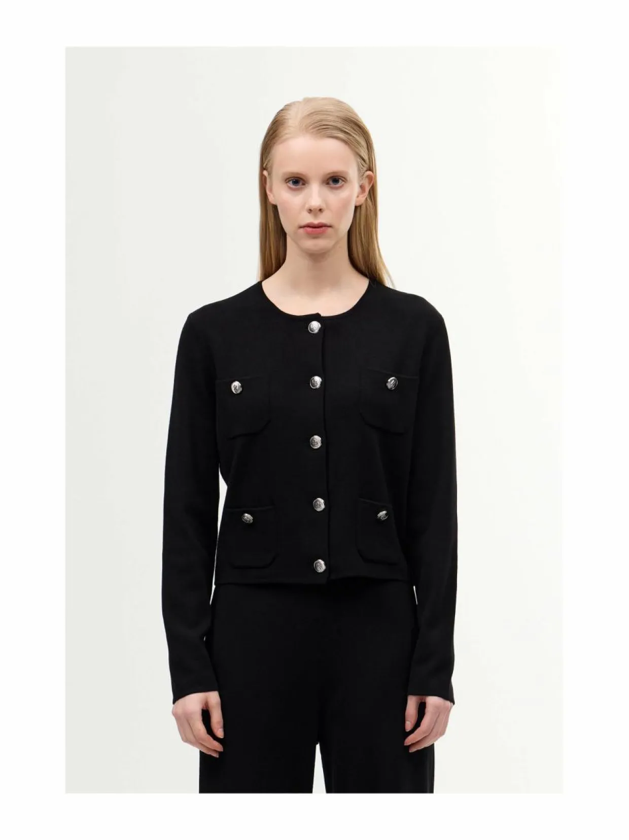 Tämä neule on valmistettu pehmeästä merinovillasta, joka tarjoaa erinomaisen lämmön ja mukavuuden. Sen suunnittelussa on kiinnitetty huomiota yksityiskohtiin, kuten koristeellisiin nappisomisteisiin ja taskuihin. Neuleen istuvuus on huoliteltu ja se luo ajatonta eleganssia. Merinovilla on hengittävä materiaali, joka tuntuu miellyttävältä iholla ja sopii monenlaisiin tilanteisiin.