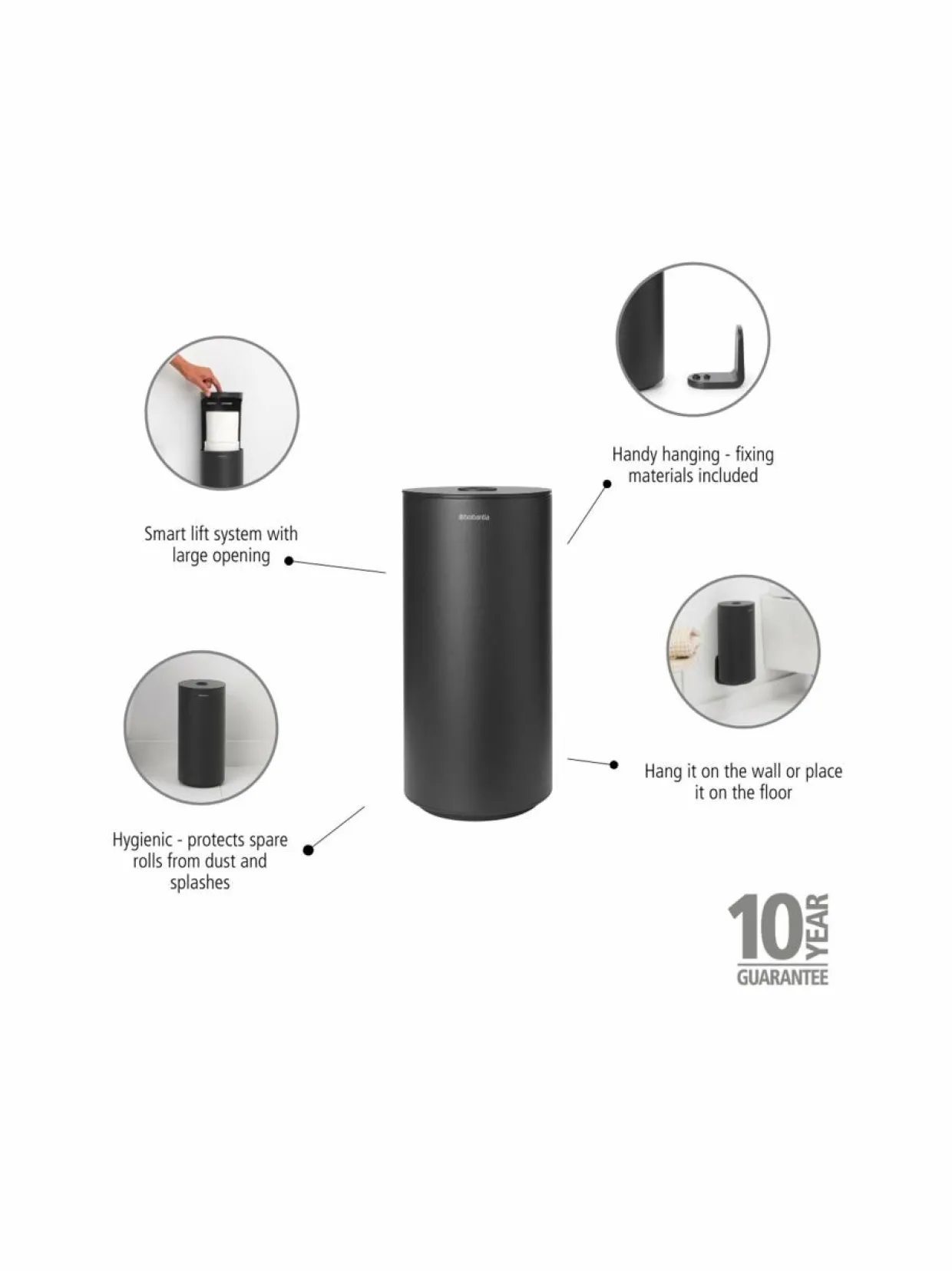 Minimalistiseen WC-paperin säilytystelineeseen saa säilöön kaksi tavallista WC-paperirullaa. Kantta nostamalla rullat nousevat näppärästi käden ulottuville, tehden rullien poistamisesta ja lisäämisestä erityisen vaivatonta. Elegantin telineen voi kiinnittää myös seinälle. Säilytysteline suojaa WC-paperirullia pölyltä ja vesiroiskeilta. Pakkauksessa mukana myös asennusohjeet sekä kiinnitysmateriaalit.