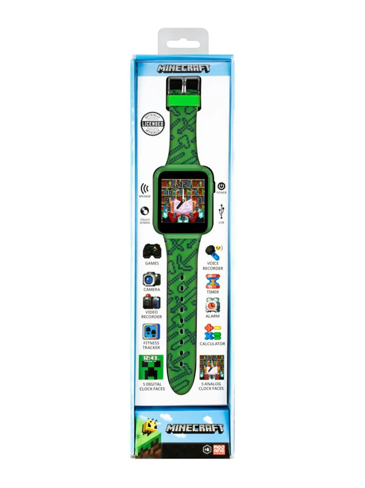 Tuo pala suosituimpaan videopeliin perustuvaa kiehtovaa Minecraft-maailmaa oikeaan elämään! Esittelyssä interaktiivinen Minecraft-älykello, jossa on kuvitettu pehmeä silikoniranneke. Kellossa on kosketusnäyttö ja 10 kellotaulua (5 analogista ja 5 digitaalista), selfie-/videokamera, herätys/sekuntikello/ajastin, nauhuri ja laskin. Kellon mukana toimitetaan USB-kaapeli lataamista ja tiedonsiirtoa varten.