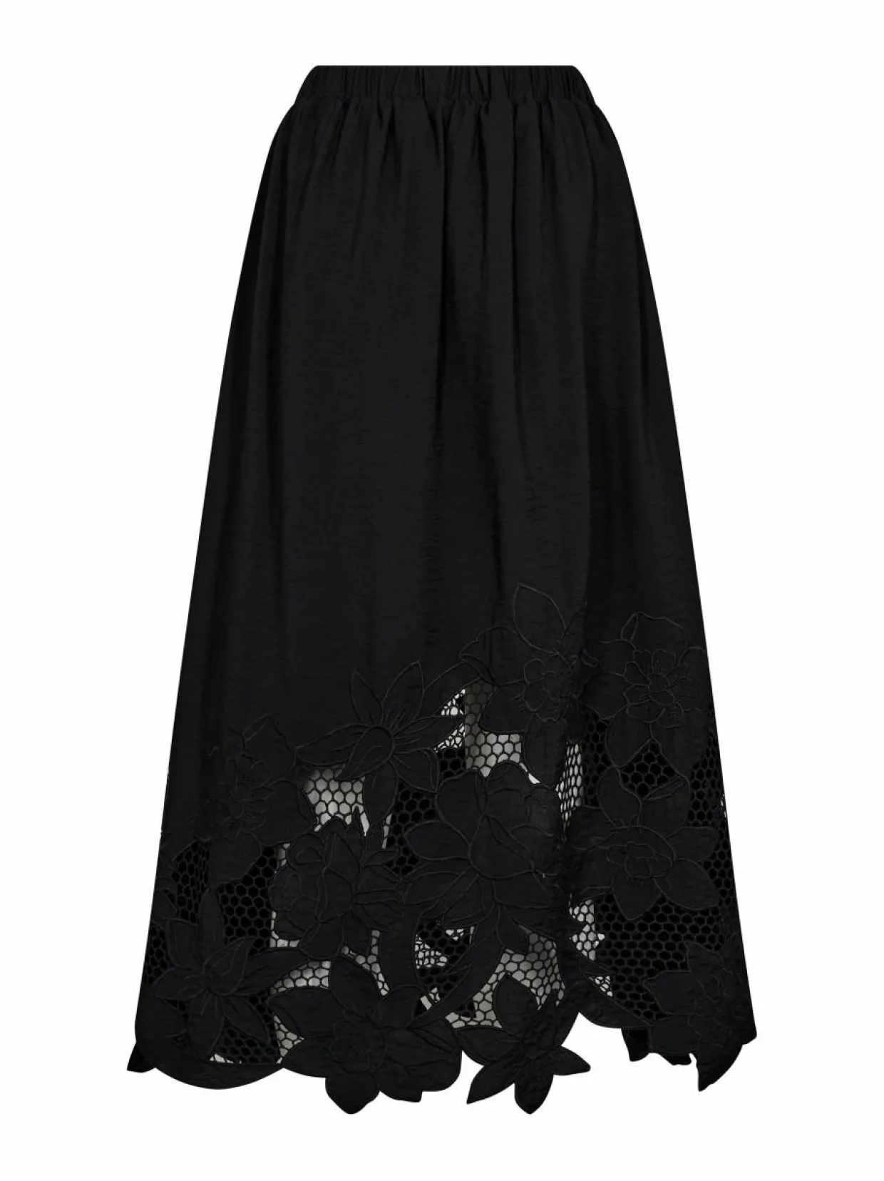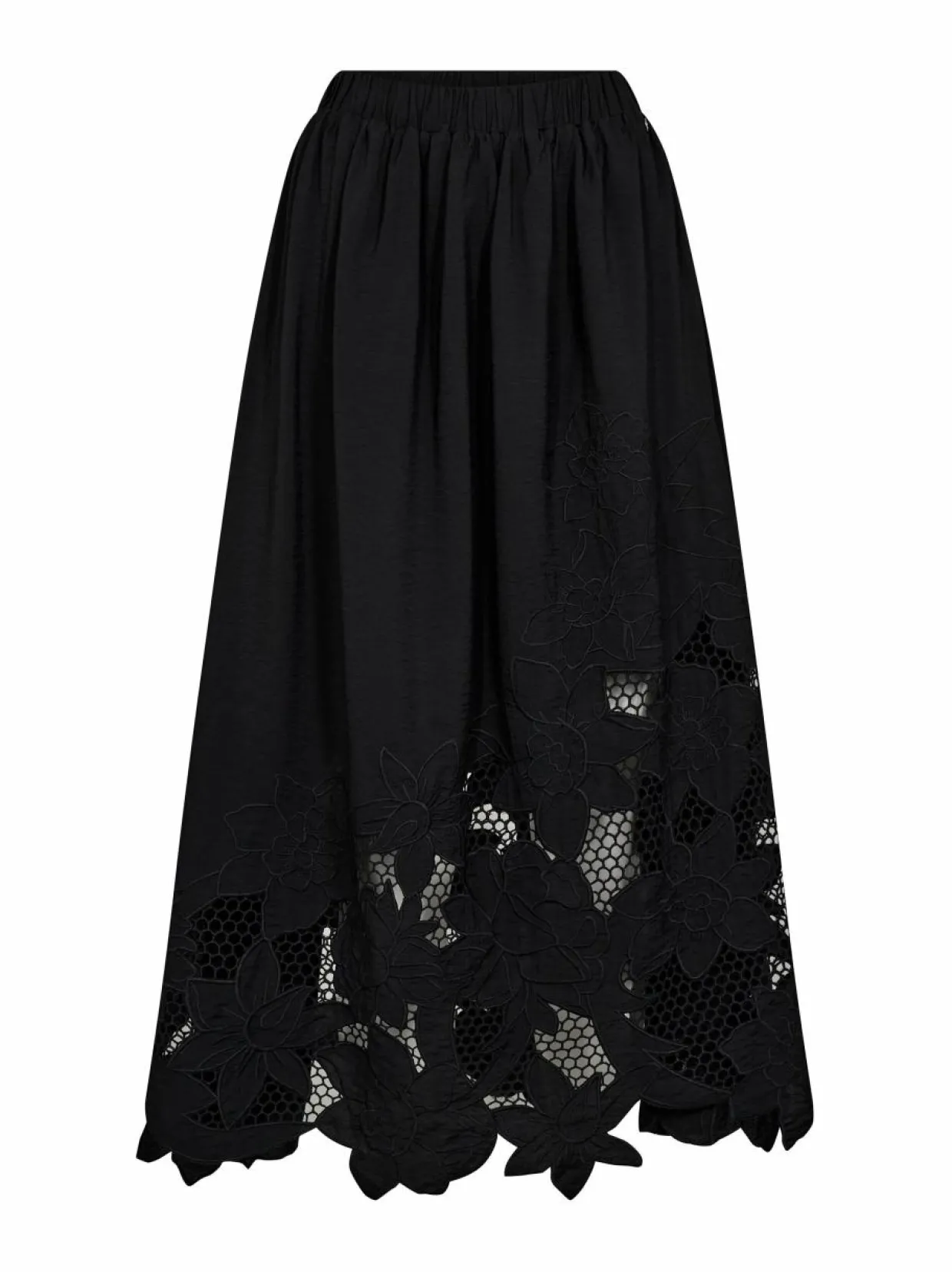 MMZorai Brodie -hameessa on midipituinen ja alaspäinlevenevä malli. Pehmeä ja laskeutuva materiaali tekee siitä mukavan päällä. Materiaali sisältää Ecovero-viskoosia ja polyamidia, jotka takaavat hengittävyyden ja kestävyyden. Hameen helmaa koristavat läpikuultavat kukkabrodeeraukset. Hame sopii esim. erilaisiin tapahtumiin ja juhliin.