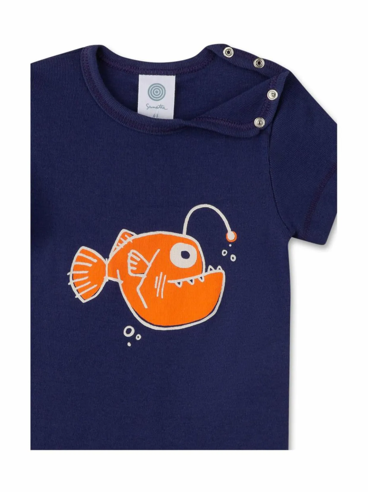 Sanetta Monkfish -body on valmistettu 100 % puuvillasta, mikä tekee siitä miellyttävän ja hengittävän. Bodyssa on olkapäällä ja haaraosassa kätevät nepparit, jotka helpottavat pukemista ja vaipanvaihtoa. Sen merellinen monnikuvio tuo vaatteeseen iloista ilmettä.