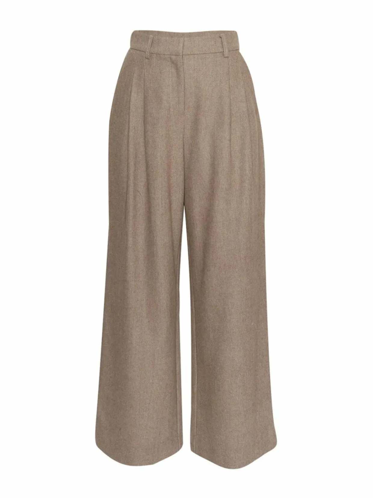 MSCH Copenhagen MSCHJennabella-housut ovat täydellinen valinta talven viileisiin päiviin. Näissä korkeavyötäröisissä, leveälahkeisissa puvunhousuissa on laskokset, taskut sekä vetoketju- ja nappikiinnitys, mikä tuo niihin klassista ilmettä ja toimivuutta. Housut on valmistettu miellyttävästä villasekoitteesta, joka tarjoaa lisälämpöä ja mukavuutta kylmiin kuukausiin. Viskoosi tuo kankaan pintaan miellyttävää sileyttä ja joustoa, kun taas polyesteri lisää materiaalin kestävyyttä. Lämmin sävy viimeistelee tyylin, tuoden asuusi pehmeyttä ja hienostuneisuutta.