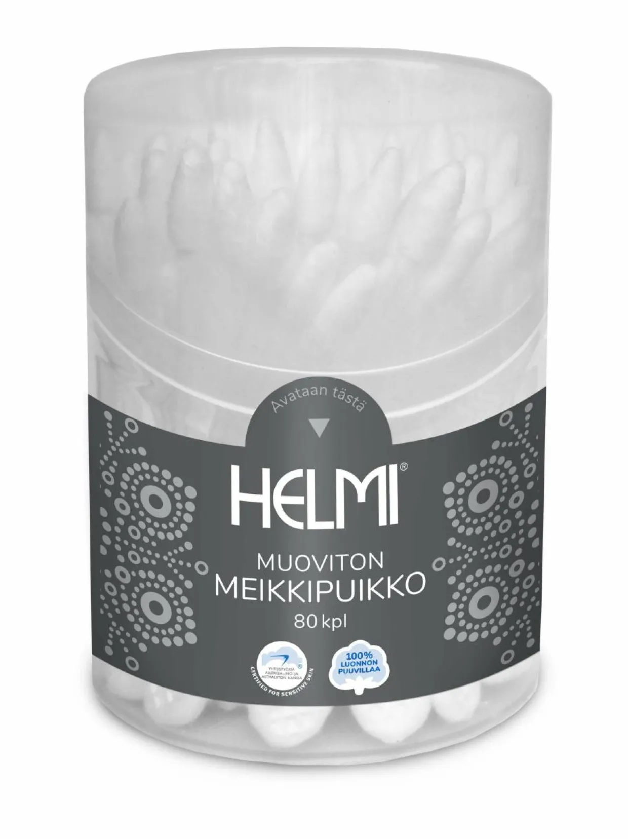 Muovittomassa Helmi-meikkipuikossa on paperivarsi ja kaksi erilaista luonnonpuuvillaista päätä. Allergia-, iho- ja astmaliiton merkki. Uudistunut pakkausilme sopii erinomaisesti kylpyhuoneen sisustukseen.