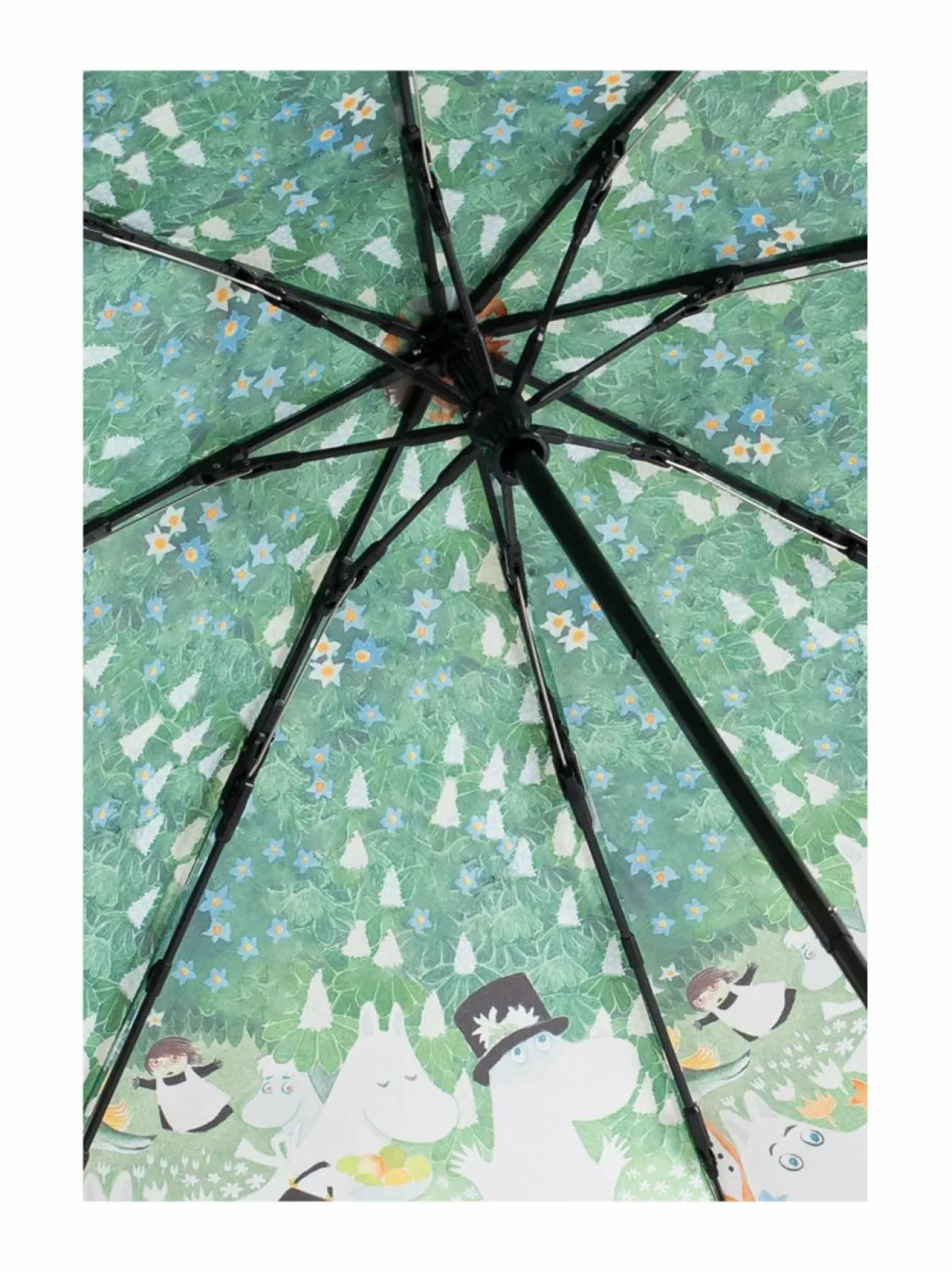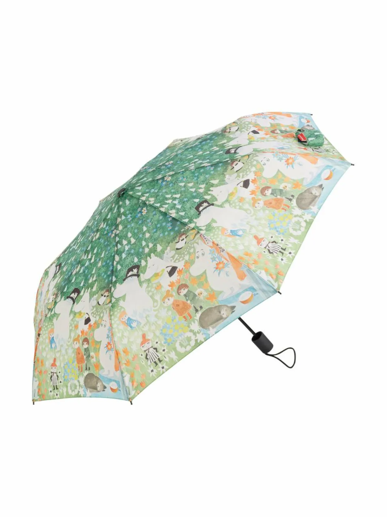 Vankka sateenvarjo teräs- ja alumiinirungolla sekä hienolla muumikuviolla. Avataan helposti napin painalluksella. Mallissa on lenkki, jolla sateenvarjon voi ripustaa esim. naulakkoon säilytettäväksi.