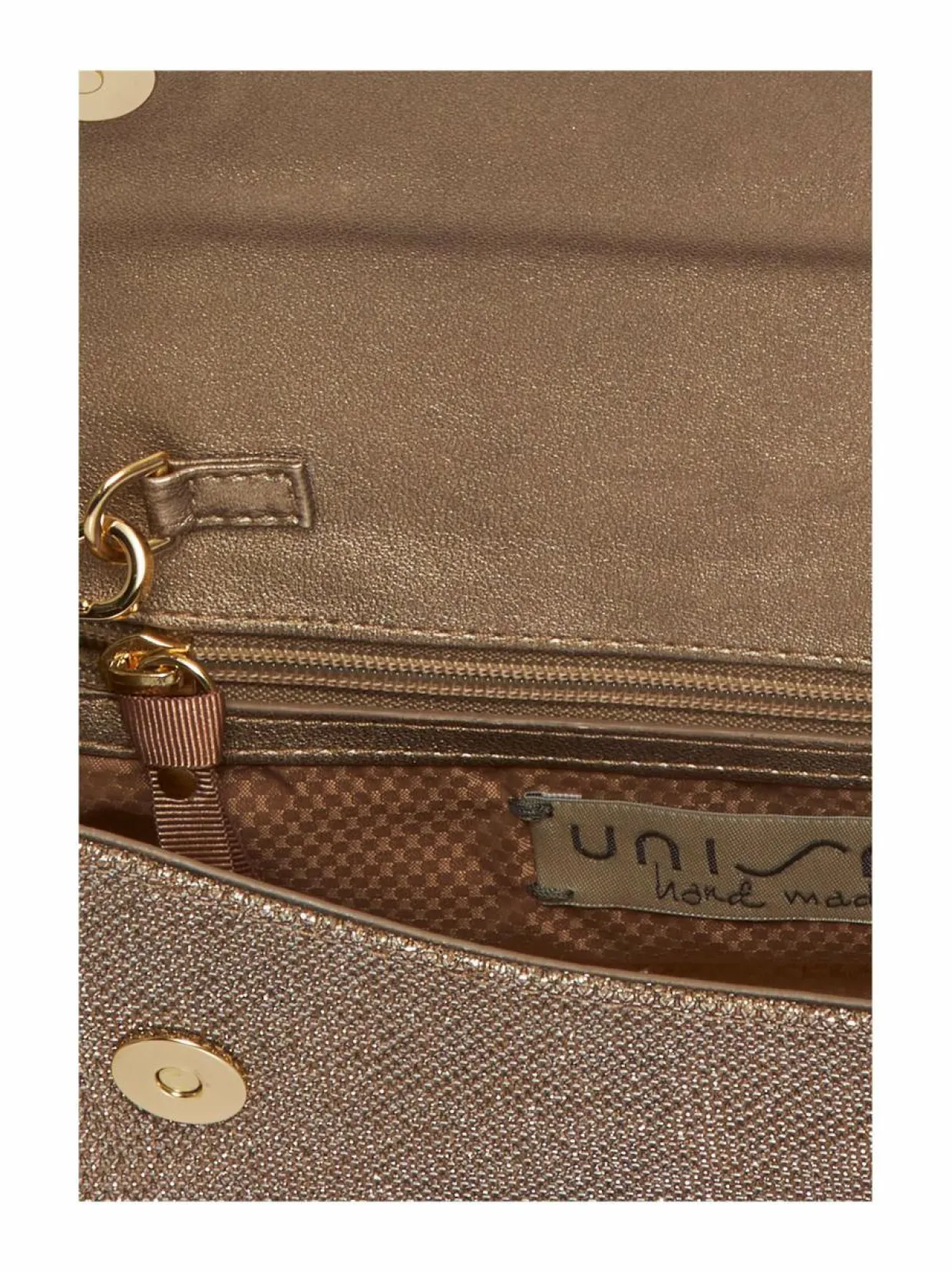 Kompakti kapeamallinen käsilaukku Unisa merkiltä. Metallinhohtoisesta nahasta ja tekstiilistä valmistettu laukku sopii täydentämään myös juhlavampaa asukokonaisuutta. Laukku suljetaan kahdella magneetilla ja sisältä löydät päälokeron lisäksi myös vetoketjutaskun.