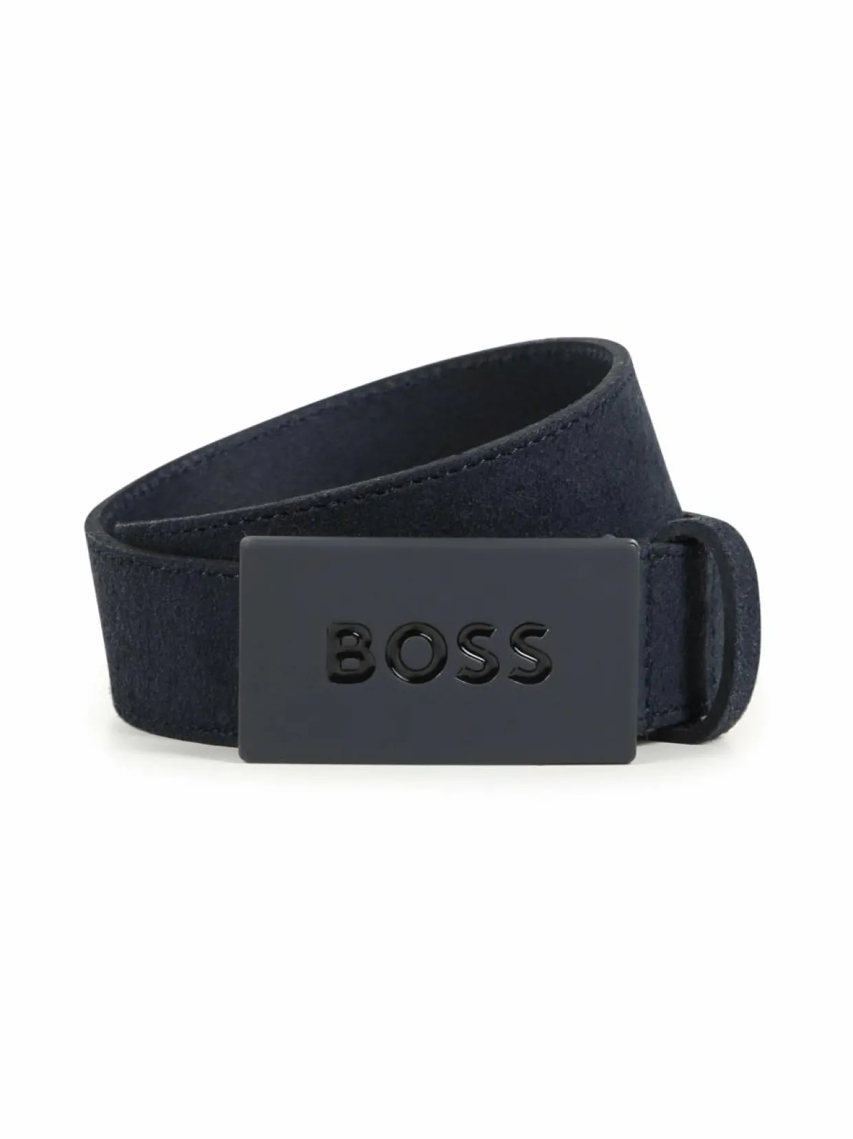 Bossin monochrome-tyylinen nahkavyö logokaiverretulla metallisoljella.