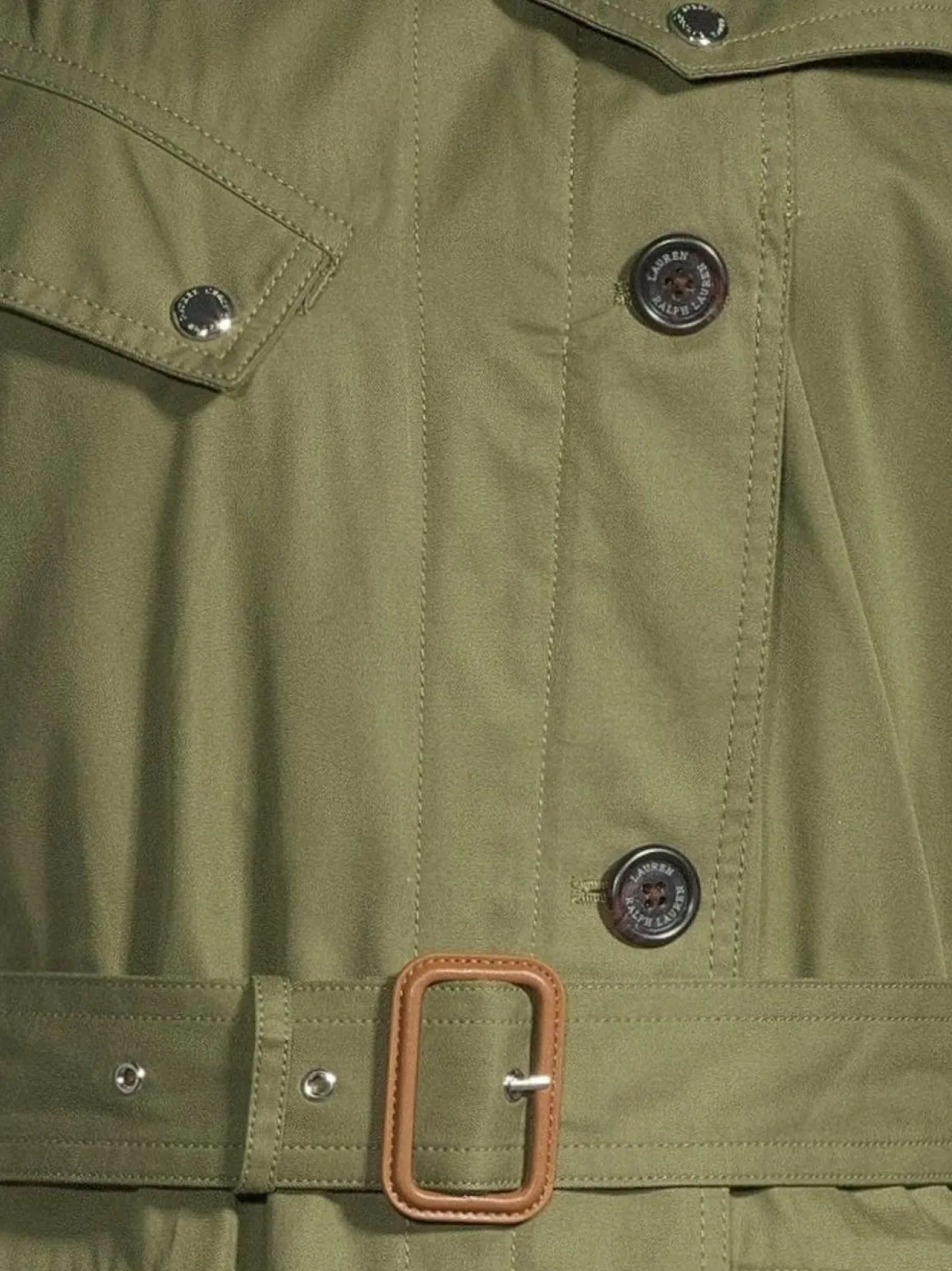 Materiaali100 % puuvilla PesuohjeetKemiallinen pesu VäriOLIVE GROVE AvainsanatRalph Lauren, takki, naisten takki, kevättakki, syksytakki, trenssi, kevyt takki