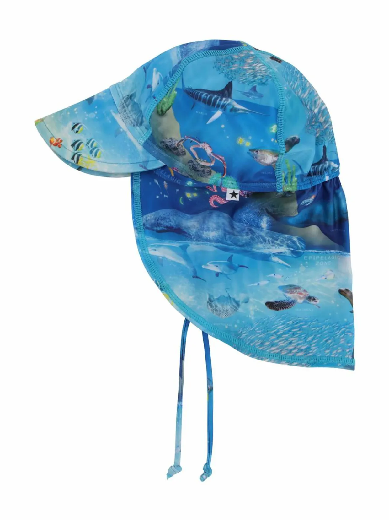 Hellehattu hienossa Ocean Zones -kuosissa. Se suojaa lapsen päätä auringolta. Hatussa on 50+ UV-suoja ja niskaa suojaava pidempi takaosa. Solmimisnauhat pitävät hatun hyvin päässä.