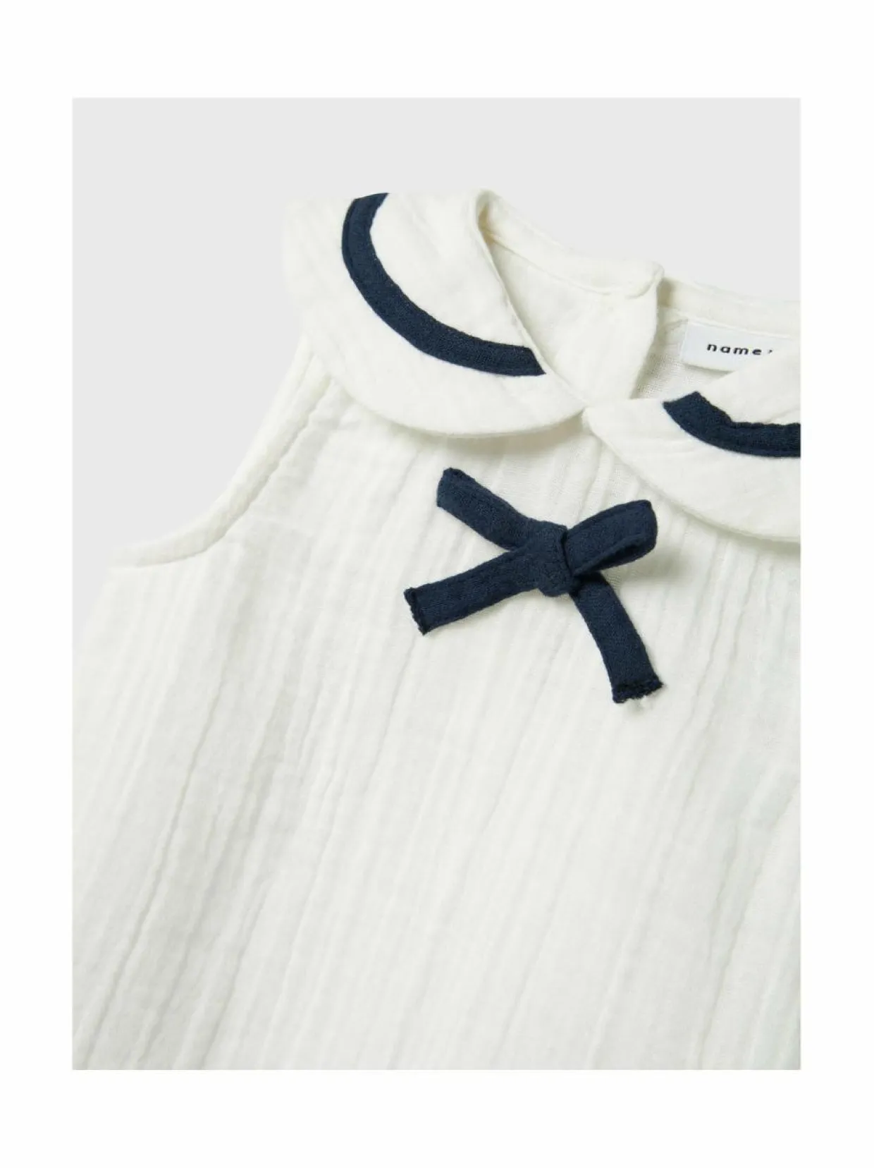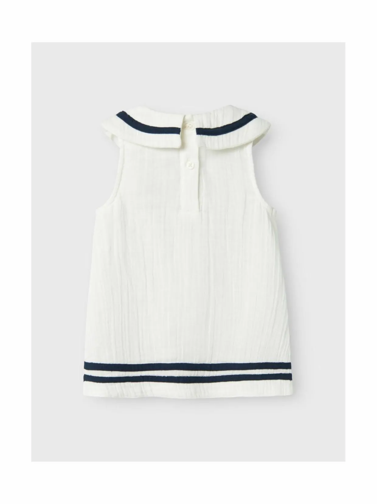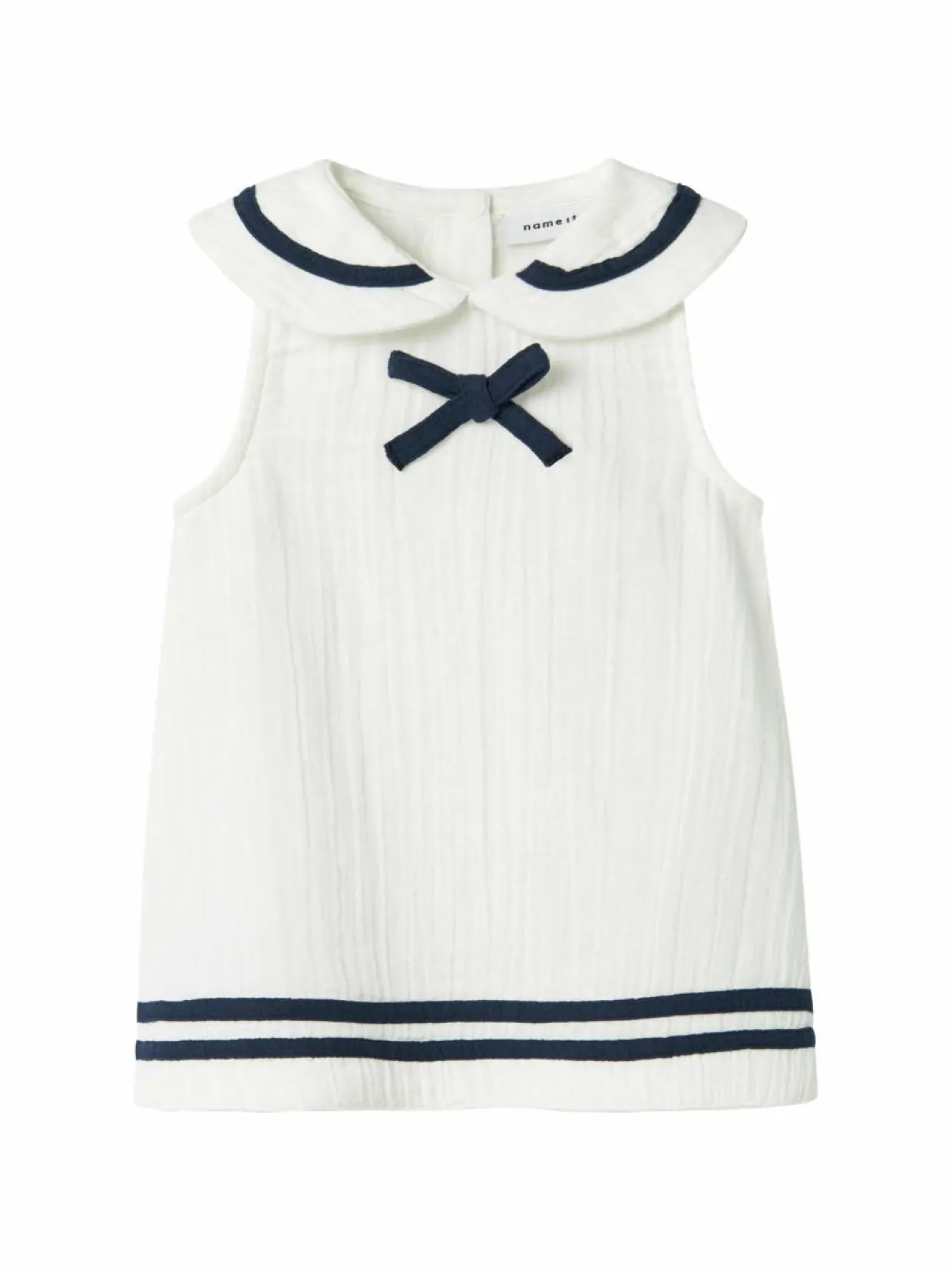 NAME IT -merkin söpö mekko on valmistettu pehmeästä ja hengittävästä puuvillasta. Mekossa on kaunis merimieshenkinen kaulus ja raidoitus. Rusetti on solmittu kauniisti eteen. Tämä mekko sopii täydellisesti kesäpäiviin.