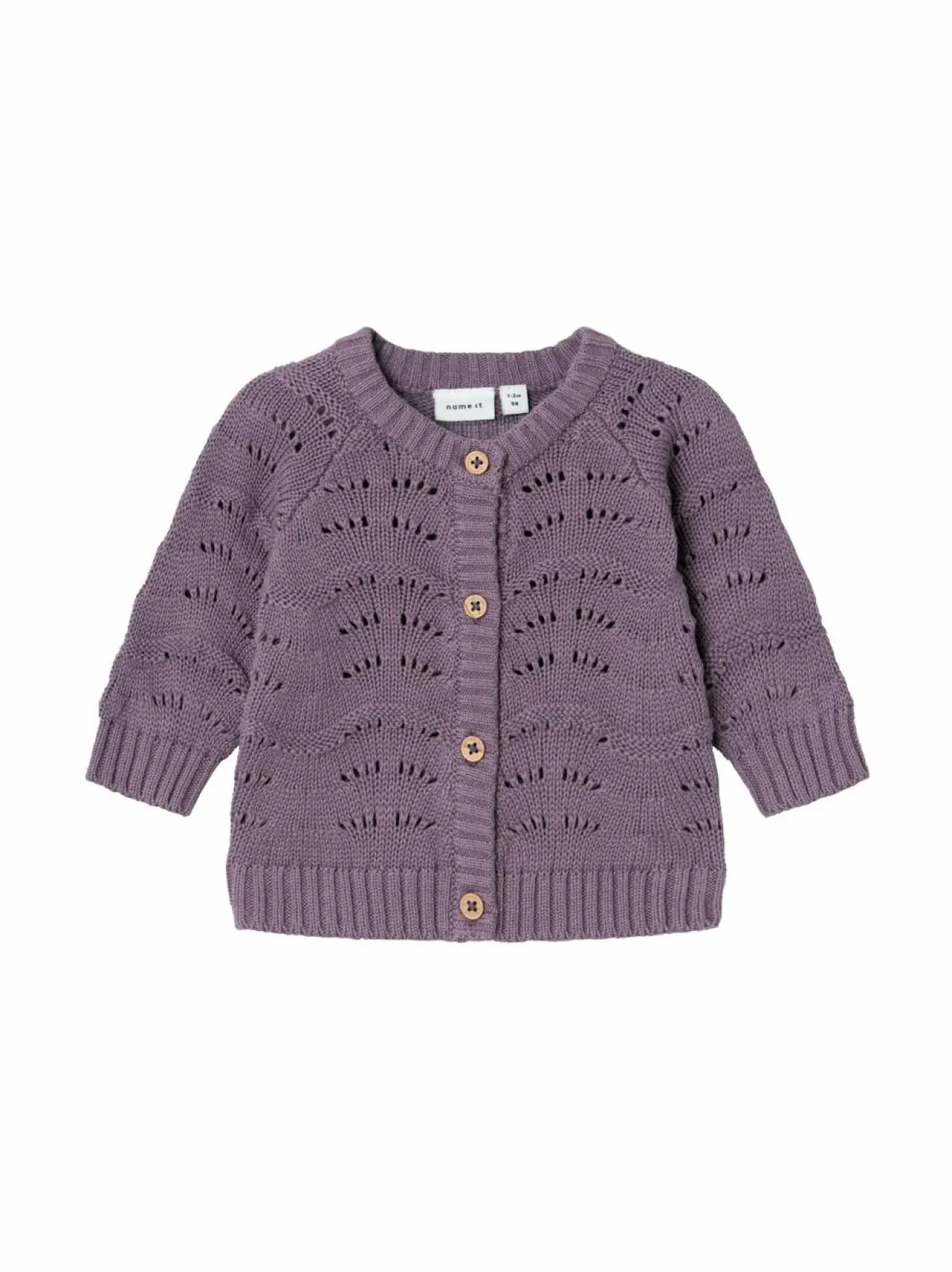 Name It:in NbfNesanne-neuletakki on puuvillasta valmistettu kuvioneulottu takki pienokaiselle. Takissa on nappilista luonnonläheisessä värisävyssä ja reunoilla joustinneuleresorit. Materiaalina 100 % luomupuuvilla, joka on hyväksi sekä ympäristölle että terveydelle.