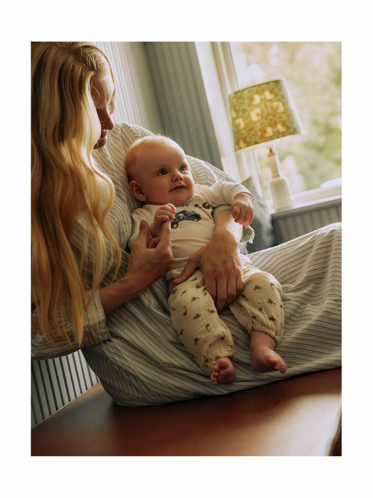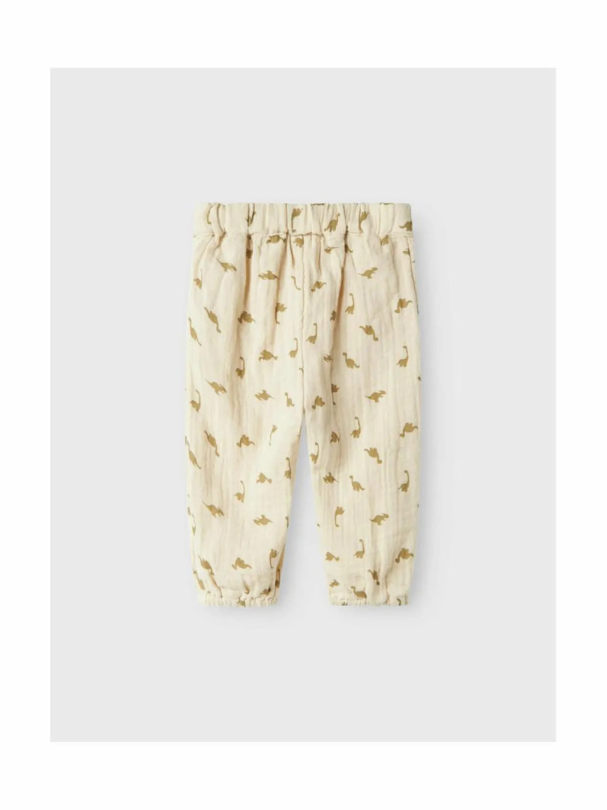 Nämä Name It -merkin housut on valmistettu sataprosenttisesta luomupuuvillasta. Housuissa on leikkisä dinosauruskuviointi, joka tuo hauskaa ilmettä asuun. Joustava vyötärö ja lahkeensuut takaavat hyvän istuvuuden ja mukavuuden vauvan liikkeissä.