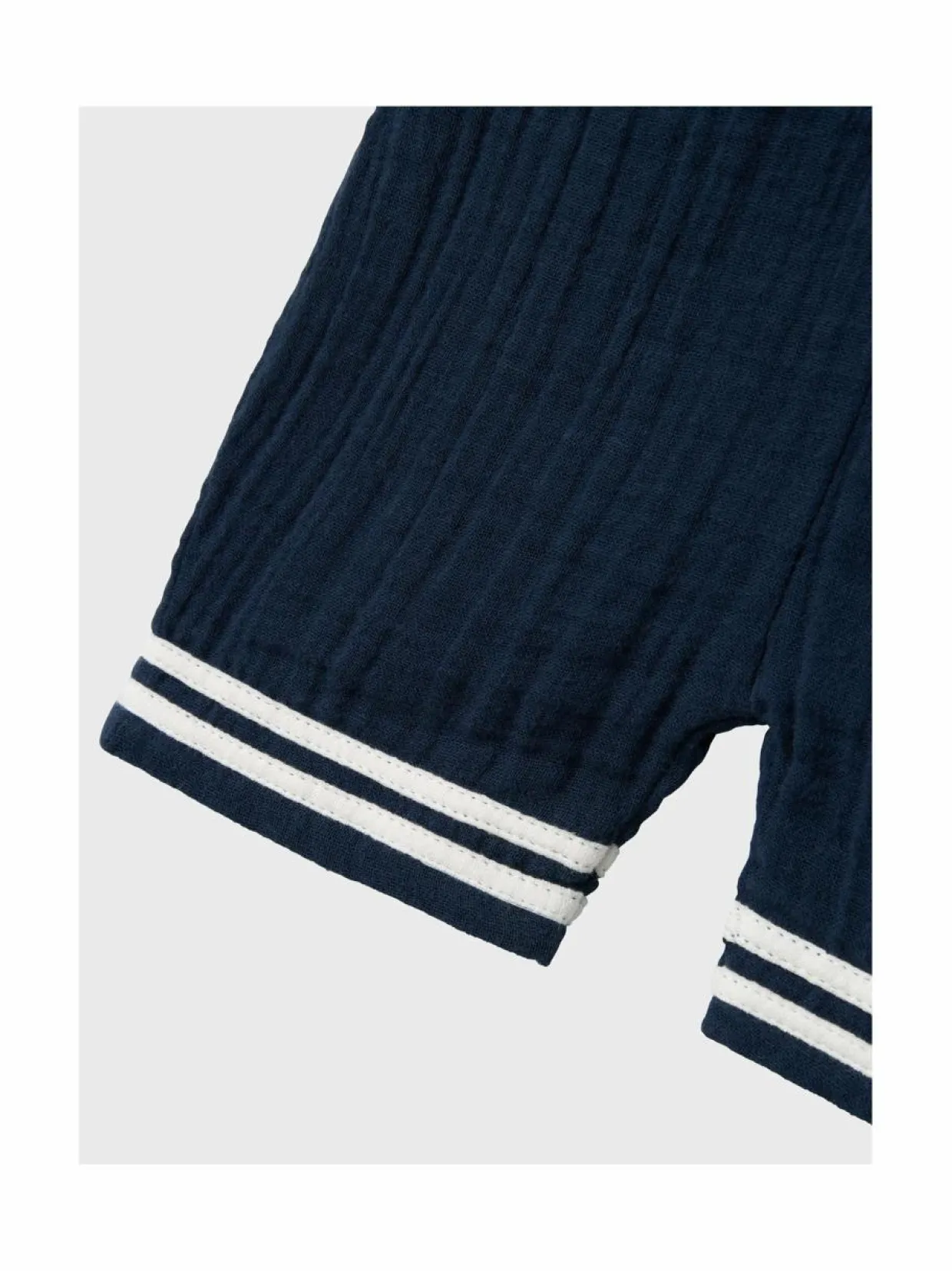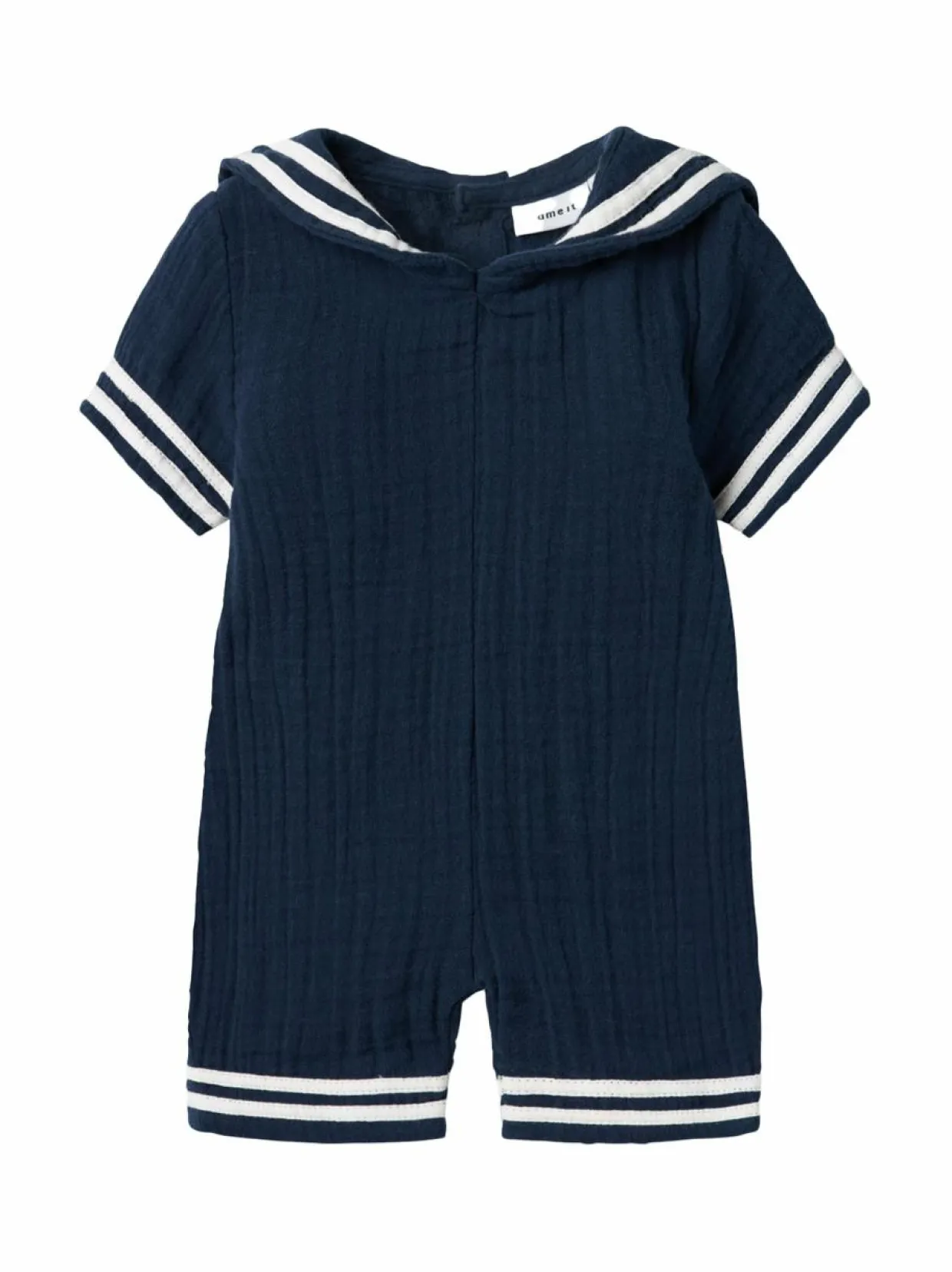 Mukava ja käytännöllinen shortsiasu vauvoille ja pienille lapsille. Haalari on valmistettu pehmeästä ja hengittävästä puuvillasta, joka on mukava iholle. Siinä on myös söpö merimieshenkinen kaulus ja raidoitus.