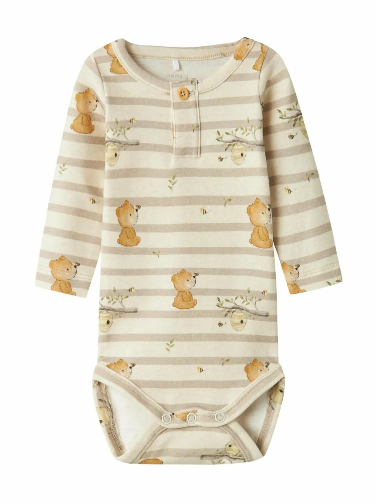 Name It -merkin pitkähihainen body on pehmeä ja mukava valinta perheen pienimmille. Tämä suloisilla nallekuvioilla koristeltu body on valmistettu miellyttävän tuntuisesta materiaalista, joka sisältää hengittävää puuvillaa, kestävää lyocellia ja hieman elastaania mukavan joustavuuden takaamiseksi. Nepparikiinnitys haaraosassa helpottaa pukemista ja vaipanvaihtoa, ja kauniit raidat sekä pienet yksityiskohdat tekevät tästä bodysta iloisen ja leikkisän.