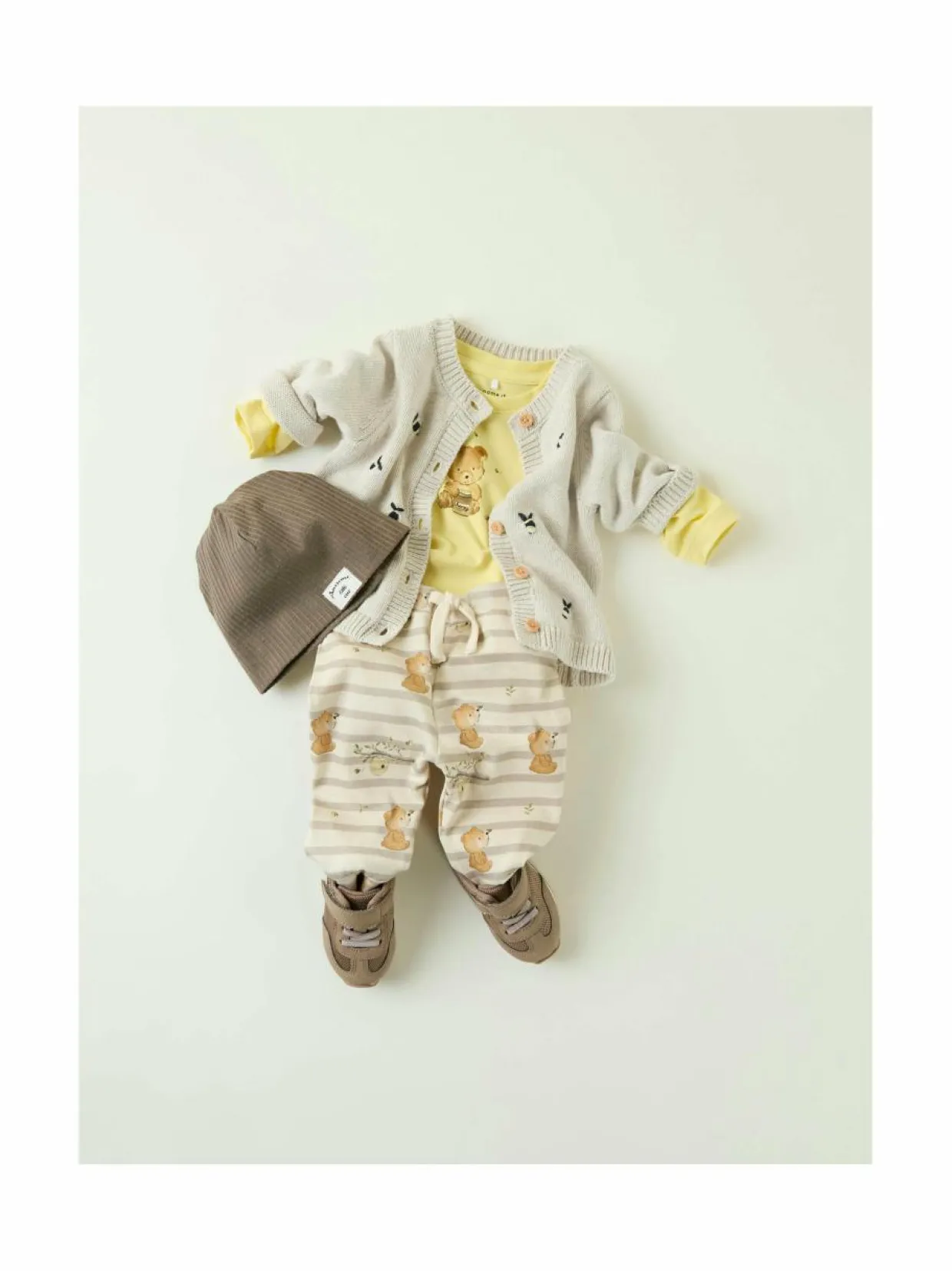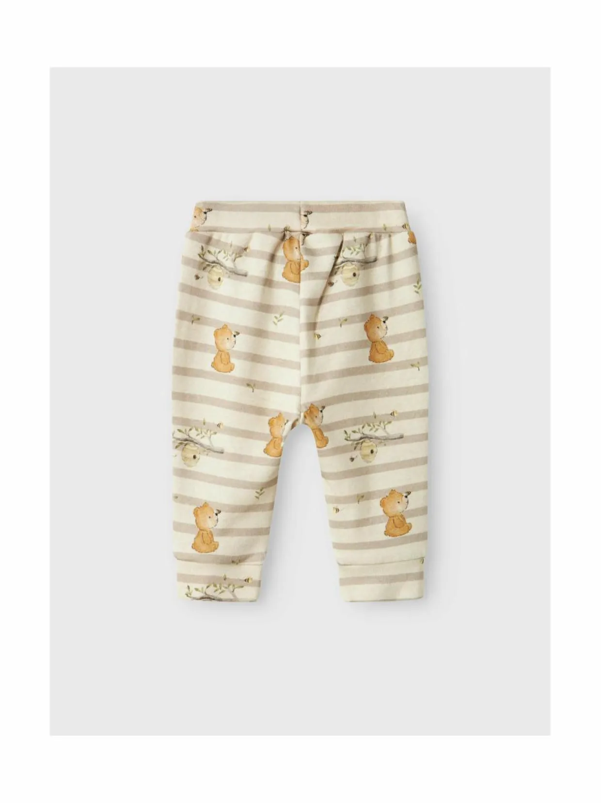 Name It -merkin raitahousuissa on suloinen nallekuosi. Pehmeä puuvillan ja lyocellin sekoite tuntuu miellyttävältä ihoa vasten, ja elastaani lisää joustavuutta. Vyötäröllä on kiristysnauha, jolla housut saa säädettyä hyvin istuviksi, ja lahkeensuissa on resorit, jotka pitävät housut mukavasti paikoillaan.