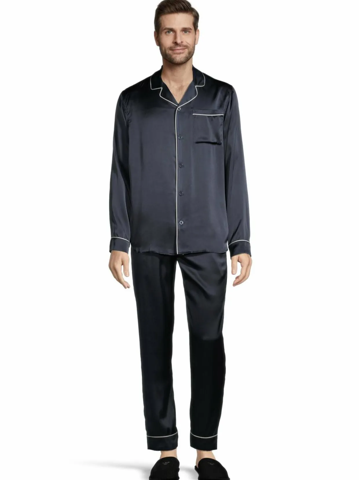 Ylellisen pehmeä pyjama on upeaa silkkiä. Pyjama koostuu pitkähihaisesta kauluspaidasta, jossa kokopitkä napitus ja rintatasku. Housuissa on mukavat taskut sekä joustava ja säädettävä vyötärölinja. Silkkipyjama tulee hienossa Stockmannin 160 juhlavuoden lahjapakkauksessa.