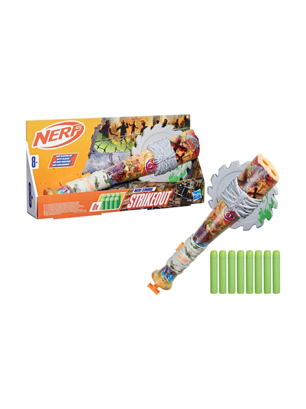 Nerf Zombie Strikeout -leikkipyssyn molemmilla puolilla on huomiota herättäviä värikkäitä zombi-aiheisia graffiteja. Leikkipyssy näyttää taisteluvarusteelta, jonka ovat suunnitelleet zombitaistelijat maailmassa, jonka hirviömäiset epäkuolleet ovat vallanneet. Zombie Strikeout -leikkipyssy näyttääkin vaurioituneelta pesäpallomailalta, johon on kiinnitetty vaahtomuovinen pyörösahanterä. Leikkiaseen kahva palautuu automaattisesti takaisin leikkiaseen sisään ampumisen jälkeen. Pakkaukseen kuuluu 8 Nerf Elite -ammusta. Nerf Zombie Strikeout -leikkipyssy, jossa on paljon hauskoja yksityiskohtia, sopii erinomaisesti kaikille zombi-faneille ja se on täydellinen lisävaruste zombi-aiheisiin bileisiin, leikkeihin ja tapahtumiin.