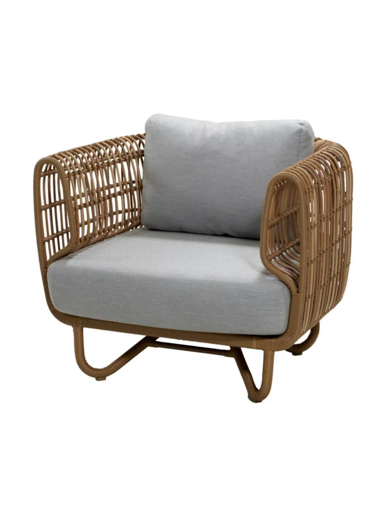 Nest-sohva ulkokäyttöön. 162 cm lev, 84 syv, 79 kork, 40 istuinkork. Istuintyyny sisältyy hintaan, vaaleanharmaa Cane-Line Natté. Luonnonvärinen Cane-line Weave® -punosmateriaali, alumiinirunko.