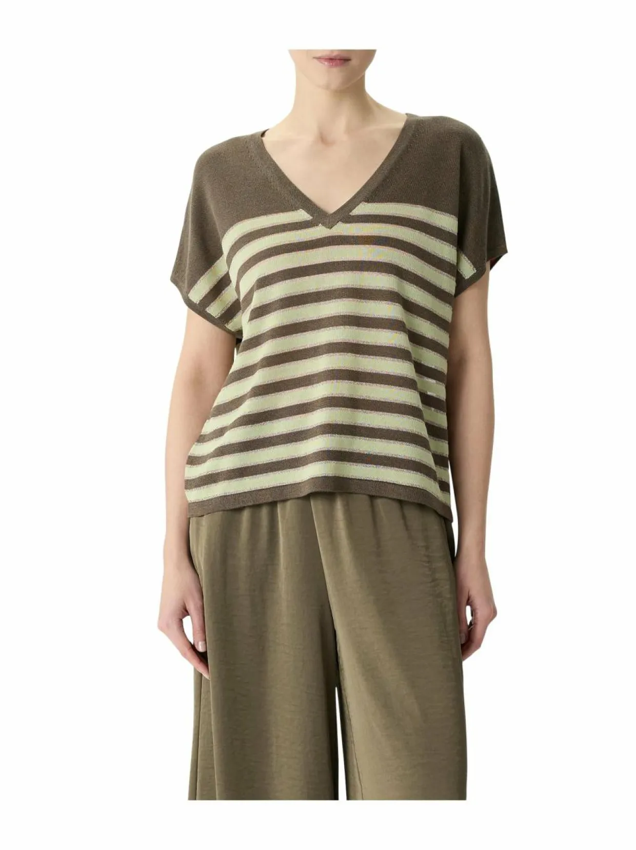 Tämä neulepusero on valmistettu pehmeästä ja hengittävästä materiaalista, joka tuntuu miellyttävältä iholla. Sen v-pääntie ja lyhyet hihat luovat rentoa ilmettä. Raitakuviointi antaa puserolle dynaamisuutta ja tämä pusero sopii täydellisesti sekä arkeen että juhlaankin, lisäksi se on helppo yhdistää eri alaosien kanssa. Materiaali on helppohoitoinen ja kestää hyvin käyttöä.