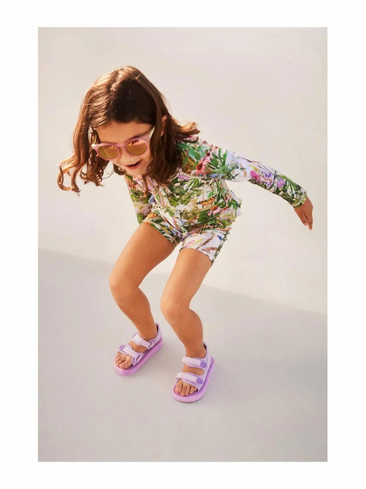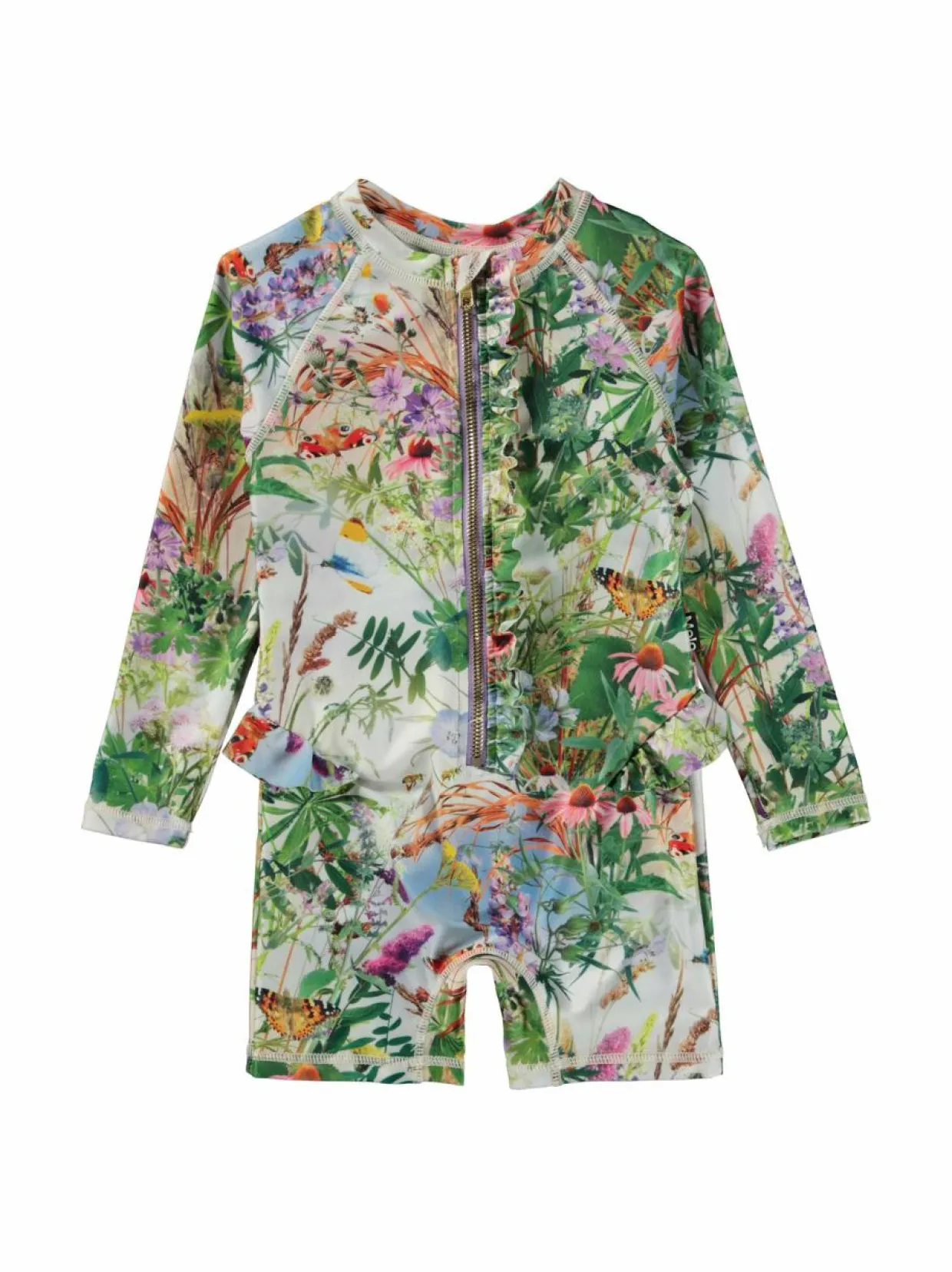 Joustava UV-suojattu (UV-suoja 50+) uimapuku hienossa Wild Nature -kuosissa. Pitkä vetoketju edessä helpottaa uima-asun pukemista. Mukavat raglanhihat ja röyhelöreunus viimeistelevät tyylin.