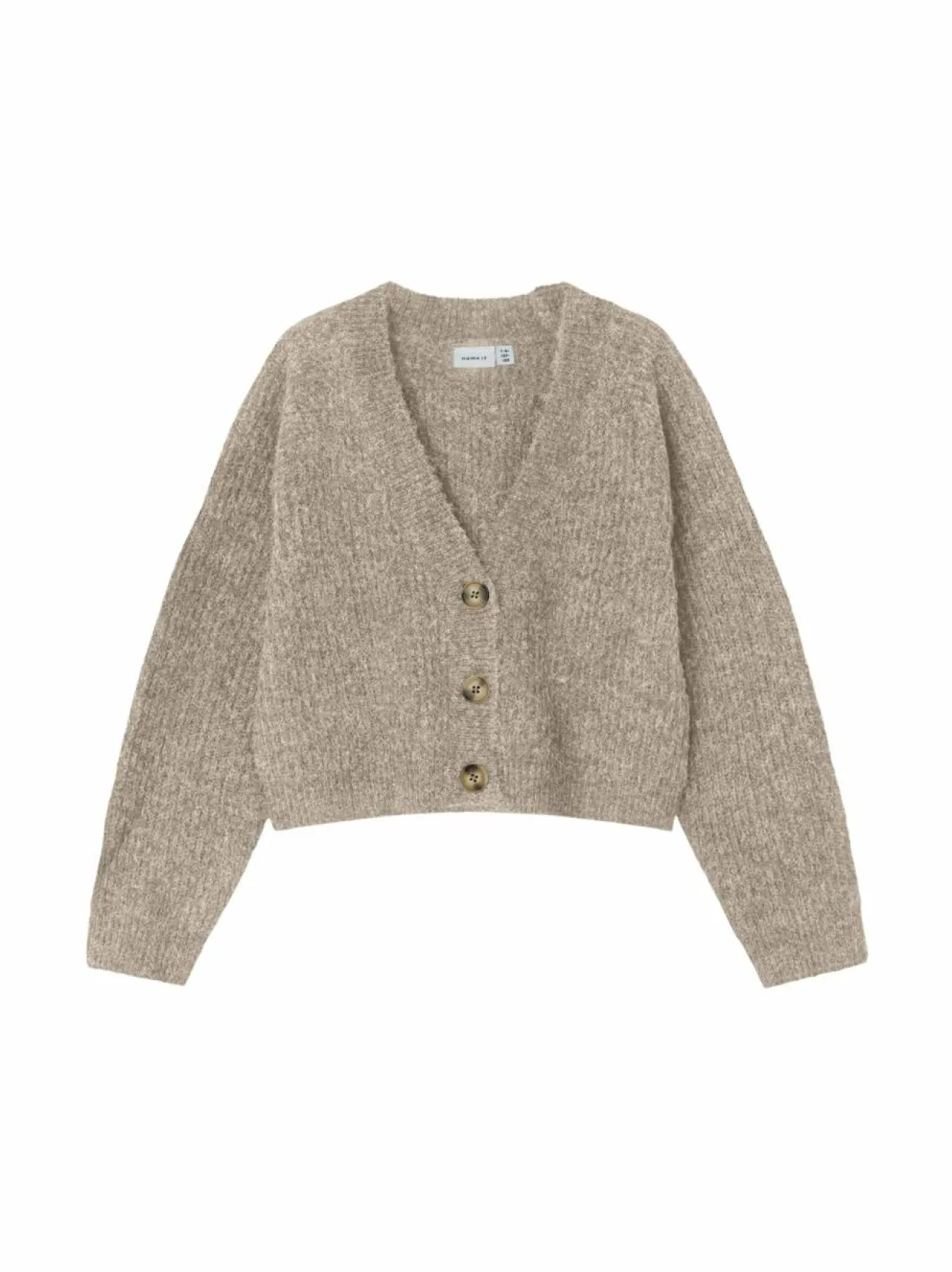 NAME IT -merkin reilun kokoisessa neuletakissa on trendikkäästi vajaamittainen, laatikkomainen leikkaus. Resorit korostavat neuleen muotoja ja luovat miellyttävän istuvuuden. Neuletakki suljetaan kolmella napilla. Materiaalissa on mukana ripaus ylellistä villaa.