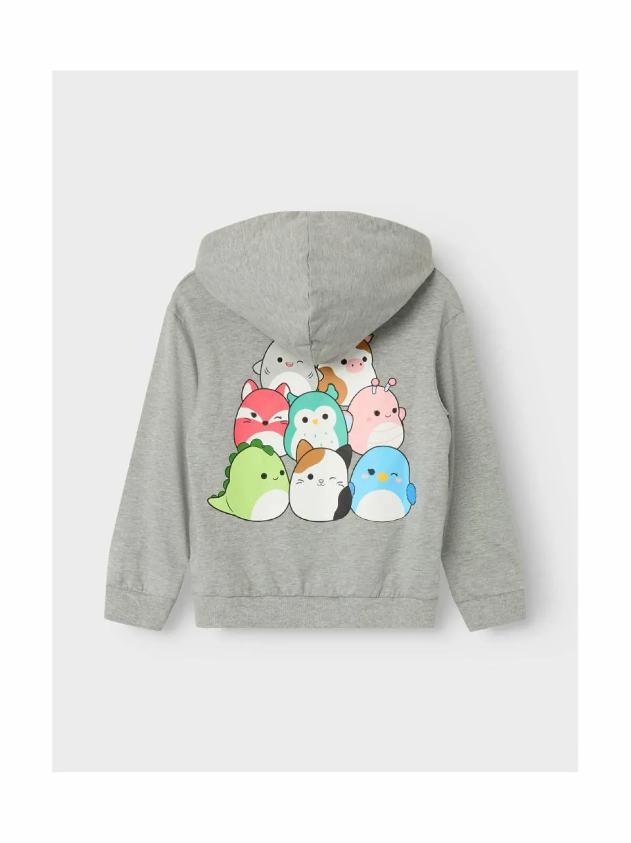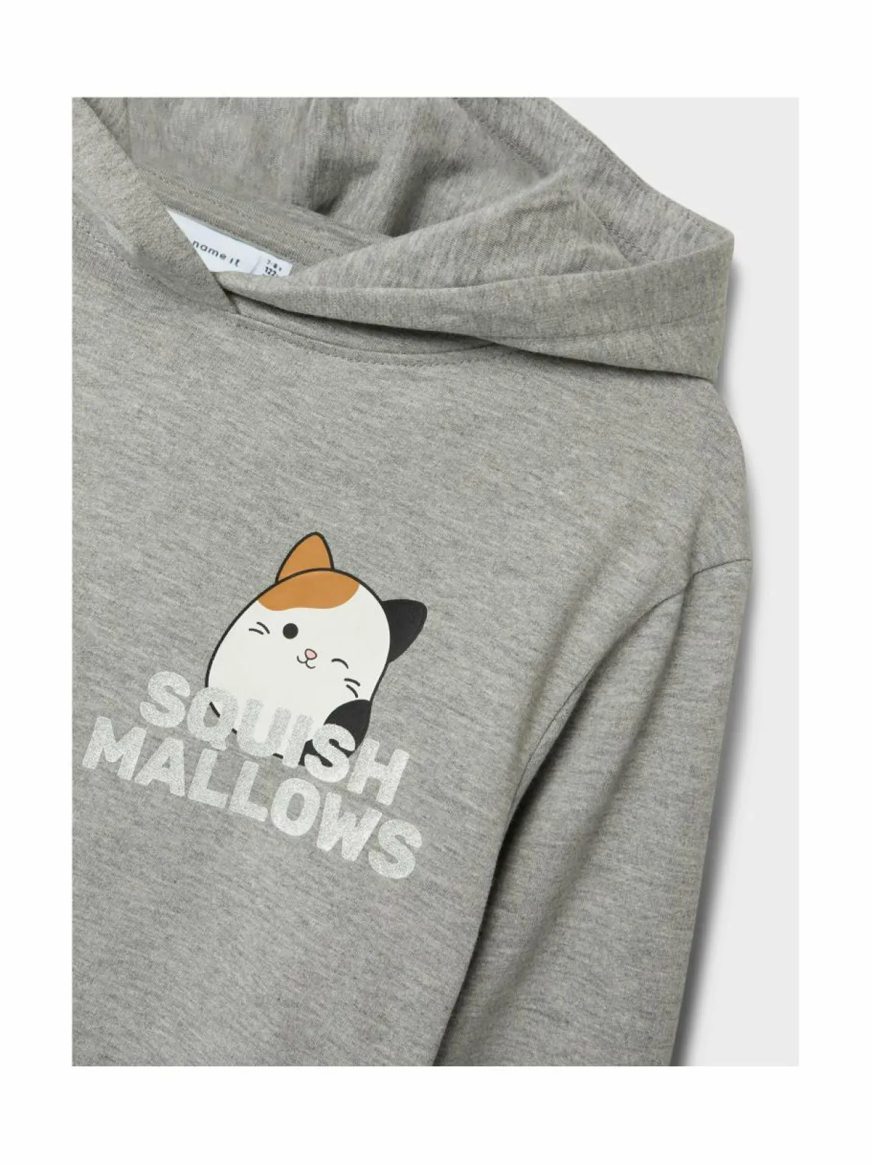 Name It:in NkfOfi Squish -huppari on valmistettu miellyttävästä puuvilla-polyesterisekoitteesta, joka on harjattu sisäpuolelta pehmeäksi fleeceksi. Hupparin rintaa somistavat hahmoprintti ja squishmallows-teksti. Helmasta ja hihansuista löytyvät resorit.